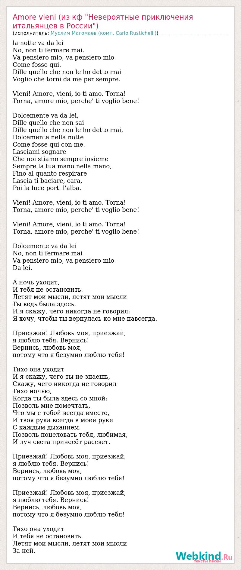 la notte va da lei No, non ti fermare mai. Va pensiero mio, va pensiero mio Come fosse qui. Dille quello che non le ho detto mai Voglio che torni da me per sempre. Vieni! Amore, vieni, io ti amo. Torna! Torna, amore mio, perche' ti voglio bene! Dolcemente va da lei, Dille quello che non sai Dille quello che non le ho detto mai, Dolcemente nella notte Come fosse qui con me. Lasciami sognare Che noi stiamo sempre insieme Sempre la tua mano nella mano, Fino al quanto respirare Lascia ti baciare, cara, Poi la luce porti l'alba. Vieni! Amore, vieni, io ti amo. Torna! Torna, amore mio, perche' ti voglio bene! Vieni! Amore, vieni, io ti amo. Torna! Torna, amore mio, perche' ti voglio bene! Dolcemente va da lei No, non ti fermare mai Va pensiero mio, va pensiero mio Da lei. А ночь уходит, И тебя не остановить. Летят мои мысли, летят мои мысли Ты ведь была здесь. И я скажу, чего никогда не говорил: Я хочу, чтобы ты вернулась ко мне навсегда. Приезжай! Любовь моя, приезжай, я люблю тебя. Вернись! Вернись, любовь моя, потому что я безумно люблю тебя! Тихо она уходит И я скажу, чего ты не знаешь, Скажу, чего никогда не говорил Тихо ночью, Когда ты была здесь со мной: Позволь мне помечтать, Что мы с тобой всегда вместе, И твоя рука всегда в моей руке С каждым дыханием. Позволь поцеловать тебя, любимая, И луч света принесёт рассвет. Приезжай! Любовь моя, приезжай, я люблю тебя. Вернись! Вернись, любовь моя, потому что я безумно люблю тебя! Приезжай! Любовь моя, приезжай, я люблю тебя. Вернись! Вернись, любовь моя, потому что я безумно люблю тебя! Тихо она уходит И тебя не остановить. Летят мои мысли, летят мои мысли За ней.
