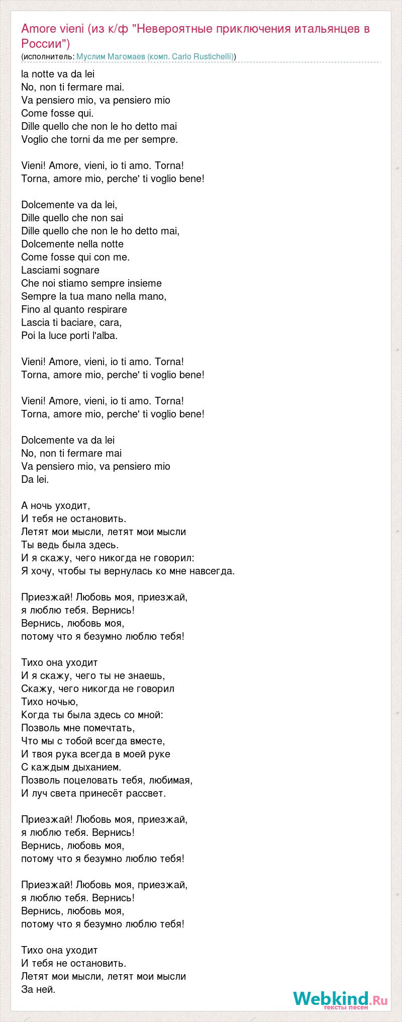 la notte va da lei No, non ti fermare mai. Va pensiero mio, va pensiero mio Come fosse qui. Dille quello che non le ho detto mai Voglio che torni da me per sempre. Vieni! Amore, vieni, io ti amo. Torna! Torna, amore mio, perche' ti voglio bene! Dolcemente va da lei, Dille quello che non sai Dille quello che non le ho detto mai, Dolcemente nella notte Come fosse qui con me. Lasciami sognare Che noi stiamo sempre insieme Sempre la tua mano nella mano, Fino al quanto respirare Lascia ti baciare, cara, Poi la luce porti l'alba. Vieni! Amore, vieni, io ti amo. Torna! Torna, amore mio, perche' ti voglio bene! Vieni! Amore, vieni, io ti amo. Torna! Torna, amore mio, perche' ti voglio bene! Dolcemente va da lei No, non ti fermare mai Va pensiero mio, va pensiero mio Da lei. А ночь уходит, И тебя не остановить. Летят мои мысли, летят мои мысли Ты ведь была здесь. И я скажу, чего никогда не говорил: Я хочу, чтобы ты вернулась ко мне навсегда. Приезжай! Любовь моя, приезжай, я люблю тебя. Вернись! Вернись, любовь моя, потому что я безумно люблю тебя! Тихо она уходит И я скажу, чего ты не знаешь, Скажу, чего никогда не говорил Тихо ночью, Когда ты была здесь со мной: Позволь мне помечтать, Что мы с тобой всегда вместе, И твоя рука всегда в моей руке С каждым дыханием. Позволь поцеловать тебя, любимая, И луч света принесёт рассвет. Приезжай! Любовь моя, приезжай, я люблю тебя. Вернись! Вернись, любовь моя, потому что я безумно люблю тебя! Приезжай! Любовь моя, приезжай, я люблю тебя. Вернись! Вернись, любовь моя, потому что я безумно люблю тебя! Тихо она уходит И тебя не остановить. Летят мои мысли, летят мои мысли За ней.