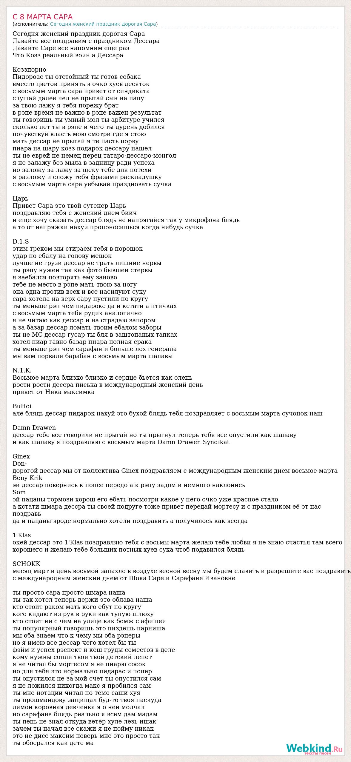 Сегодня женский праздник дорогая Сара Давайте все поздравим с праздником Дессара Давайте Саре все напомним еще раз Что Козз реальный воин а Дессара Коззпорно Пидороас ты отстойный ты готов собака вместо цветов принять в очко хуев десяток с восьмым марта сара привет от синдиката слушай далее чел не прыгай сын на папу за твою лажу я тебя порежу брат в рэпе время не важно в рэпе важен результат ты говоришь ты умный мол ты арбитуре учился сколько лет ты в рэпе и чего ты дурень добился почувствуй власть мою смотри где я стою мать дессар не прыгай я те пасть порву пиара на шару козз подарок дессару нашел ты не еврей не немец перец татаро-дессаро-монгол я не залажу без мыла в задницу ради успеха но заложу за лажу за щеку тебе для потехи я разложу и сложу тебя фразами раскладушку с восьмым марта сара уебывай праздновать сучка Царь Привет Сара это твой сутенер Царь поздравляю тебя с женский днем биич и еще хочу сказать дессар блядь не напрягайся так у микрофона блядь а то от напряжки нахуй пропоносишься когда нибудь сучка D.1.S этим треком мы стираем тебя в порошок удар по ебалу на голову мешок лучше не грузи дессар не трать лишние нервы ты рэпу нужен так как фото бывшей стервы я заебался повторять ему заново тебе не место в рэпе мать твою за ногу она одна против всех и все насилуют суку сара хотела на верх сару пустили по кругу ты меньше рэп чем пидарокс да и кстати а птичках с восьмым марта тебя рудик аналогично я не читаю как дессар и на страдаю запором а за базар дессар ломать твоим ебалом заборы ты не МС дессар гусар ты бля в заштопаных тапках хотел пиар гавно базар пиара полная срака ты меньше рэп чем сарафан и больше лох генерала мы вам порвали барабан с восьмым марта шалавы N.1.K. Восьмое марта близко близко и сердце бьется как олень рости рости дессра писька в международный женский день привет от Ника максимка BuHoi алё блядь дессар пидарок нахуй это бухой блядь тебя поздравляет с восьмым марта сучонок наш Damn Drawen дессар тебе все говорили не прыгай но ты прыгнул теперь тебя все опустили как шалаву и как шалаву я поздравляю с восьмым марта Damn Drawen Syndikat Ginex Don- дорогой дессар мы от коллектива Ginex поздравляем с международным женским днем восьмое марта Beny Krik эй дессар повернись к попсе передо а к рэпу задом и немного наклонись Som эй пацаны тормози хорош его ебать посмотри какое у него очко уже красное стало а кстати шмара дессра ты своей подруге тоже привет передай мортесу и с праздником её от нас поздравь да и пацаны вроде нормально хотели поздравить а получилось как всегда 1'Klas окей дессар это 1'Klas поздравляю тебя с восьмы марта желаю тебе любви я не знаю счастья там всего хорошего и желаю тебе больших потных хуев сука чтоб подавился блядь SCHOKK месяц март и день восьмой запахло в воздухе весной весну мы будем славить и разрешите вас поздравить с международным женский днем от Шока Саре и Сарафане Ивановне ты просто сара просто шмара наша ты так хотел теперь держи это облава наша кто стоит раком мать кого ебут по кругу кого кидают из рук в руки как тупую шлюху кто стоит ни с чем на улице как бомж с афишей ты популярный говоришь это пиздешь парниша мы оба знаем что к чему мы оба рэперы но я имею все дессар чего хотел бы ты фэйм и успех рэспект и кеш груды семестов в деле кому нужны сопли твои твой детский лепет я не читал бы мортесом я не пиарю сосок но для теб