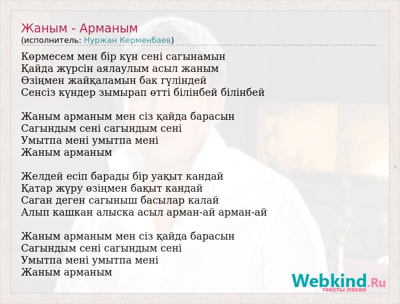 Көрмесем мен бір күн сені сагынамын Қайда жүрсін аялаулым асыл жаным Өзіңмен жайқаламын бак гүліндей Сенсіз күндер зымырап өтті білінбей білінбей Жаным арманым мен сіз қайда барасын Сагындым сені сагындым сені Умытпа мені умытпа мені Жаным арманым Желдей есіп барады бір уақыт кандай Қатар жүру өзіңмен бақыт кандай Саган деген сагыныш басылар калай Алып кашкан алыска асыл арман-ай арман-ай Жаным арманым мен сіз қайда барасын Сагындым сені сагындым сені Умытпа мені умытпа мені Жаным арманым