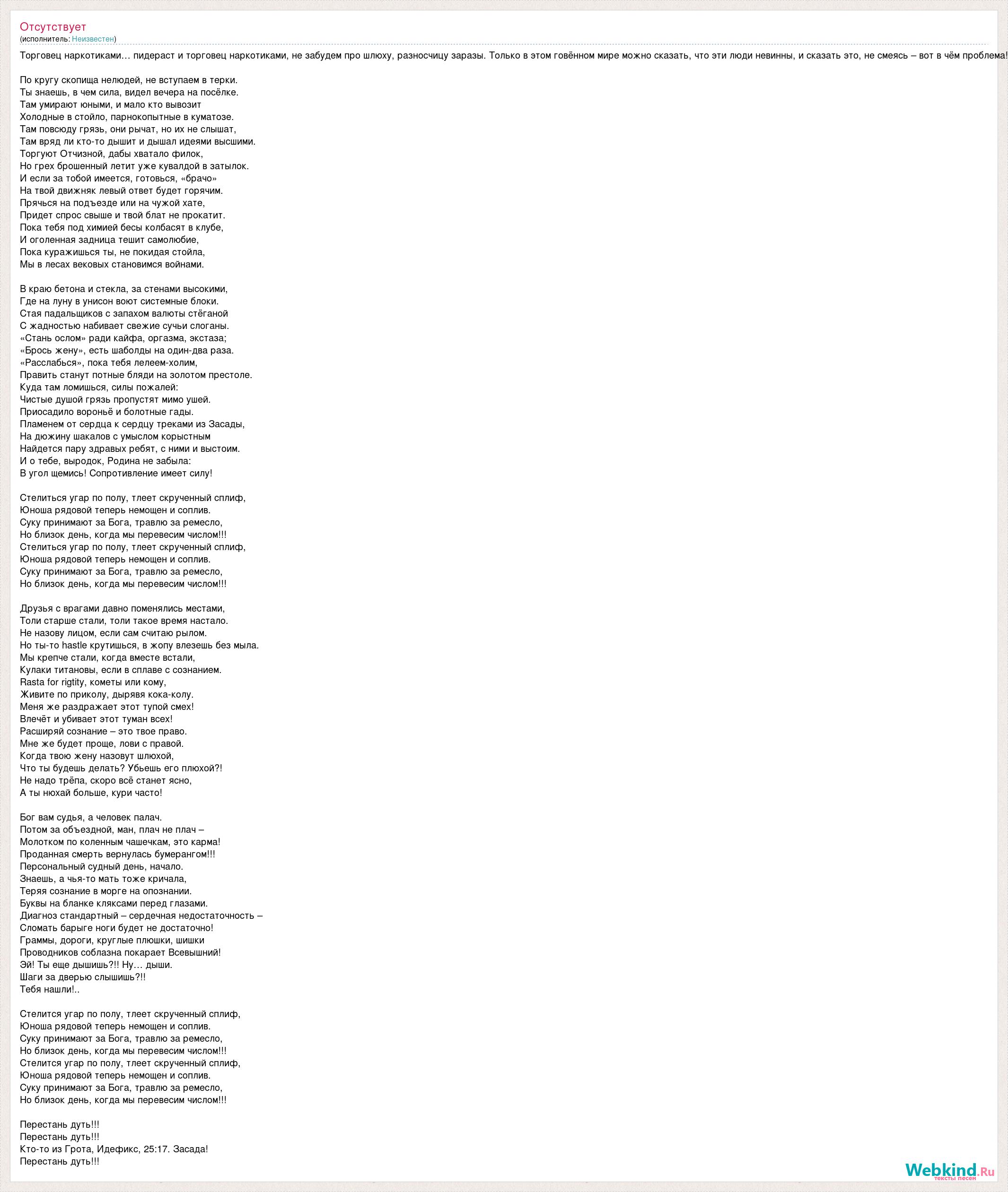 Торговец наркотиками… пидераст и торговец наркотиками, не забудем про шлюху, разносчицу заразы. Только в этом говённом мире можно сказать, что эти люди невинны, и сказать это, не смеясь – вот в чём проблема! По кругу скопища нелюдей, не вступаем в терки. Ты знаешь, в чем сила, видел вечера на посёлке. Там умирают юными, и мало кто вывозит Холодные в стойло, парнокопытные в куматозе. Там повсюду грязь, они рычат, но их не слышат, Там вряд ли кто-то дышит и дышал идеями высшими. Торгуют Отчизной, дабы хватало филок, Но грех брошенный летит уже кувалдой в затылок. И если за тобой имеется, готовься, «брачо» На твой движняк левый ответ будет горячим. Прячься на подъезде или на чужой хате, Придет спрос свыше и твой блат не прокатит. Пока тебя под химией бесы колбасят в клубе, И оголенная задница тешит самолюбие, Пока куражишься ты, не покидая стойла, Мы в лесах вековых становимся войнами. В краю бетона и стекла, за стенами высокими, Где на луну в унисон воют системные блоки. Стая падальщиков с запахом валюты стёганой С жадностью набивает свежие сучьи слоганы. «Стань ослом» ради кайфа, оргазма, экстаза; «Брось жену», есть шаболды на один-два раза. «Расслабься», пока тебя лелеем-холим, Править станут потные бляди на золотом престоле. Куда там ломишься, силы пожалей: Чистые душой грязь пропустят мимо ушей. Приосадило вороньё и болотные гады. Пламенем от сердца к сердцу треками из Засады, На дюжину шакалов с умыслом корыстным Найдется пару здравых ребят, с ними и выстоим. И о тебе, выродок, Родина не забыла: В угол щемись! Сопротивление имеет силу! Стелиться угар по полу, тлеет скрученный сплиф, Юноша рядовой теперь немощен и соплив. Суку принимают за Бога, травлю за ремесло, Но близок день, когда мы перевесим числом!!! Стелиться угар по полу, тлеет скрученный сплиф, Юноша рядовой теперь немощен и соплив. Суку принимают за Бога, травлю за ремесло, Но близок день, когда мы перевесим числом!!! Друзья с врагами давно поменялись местами, Толи старше стали, толи такое время настало. Не назову лицом, если сам считаю рылом. Но ты-то hastle крутишься, в жопу влезешь без мыла. Мы крепче стали, когда вместе встали, Кулаки титановы, если в сплаве с сознанием. Rasta for rigtity, кометы или кому, Живите по приколу, дырявя кока-колу. Меня же раздражает этот тупой смех! Влечёт и убивает этот туман всех! Расширяй сознание – это твое право. Мне же будет проще, лови с правой. Когда твою жену назовут шлюхой, Что ты будешь делать? Убьешь его плюхой?! Не надо трёпа, скоро всё станет ясно, А ты нюхай больше, кури часто! Бог вам судья, а человек палач. Потом за объездной, ман, плач не плач – Молотком по коленным чашечкам, это карма! Проданная смерть вернулась бумерангом!!! Персональный судный день, начало. Знаешь, а чья-то мать тоже кричала, Теряя сознание в морге на опознании. Буквы на бланке кляксами перед глазами. Диагноз стандартный – сердечная недостаточность – Сломать барыге ноги будет не достаточно! Граммы, дороги, круглые плюшки, шишки Проводников соблазна покарает Всевышний! Эй! Ты еще дышишь?!! Ну… дыши. Шаги за дверью слышишь?!! Тебя нашли!.. Стелится угар по полу, тлеет скрученный сплиф, Юноша рядовой теперь немощен и соплив. Суку принимают за Бога, травлю за ремесло, Но близок день, когда мы перевесим числом!!! Стелится угар по полу, тлеет скрученный сплиф, Юноша рядовой теперь немощен и соплив. Суку прин