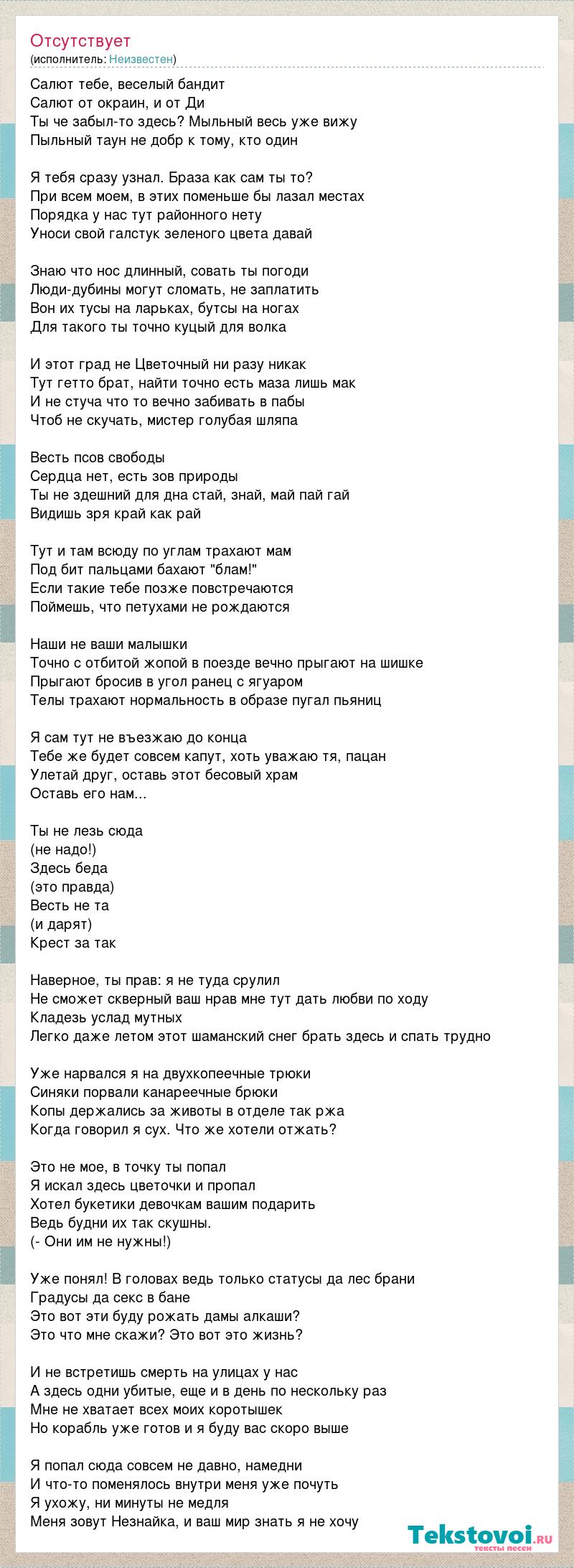 Салют тебе, веселый бандит Салют от окраин, и от Ди Ты че забыл-то здесь? Мыльный весь уже вижу Пыльный таун не добр к тому, кто один Я тебя сразу узнал. Браза как сам ты то? При всем моем, в этих поменьше бы лазал местах Порядка у нас тут районного нету Уноси свой галстук зеленого цвета давай Знаю что нос длинный, совать ты погоди Люди-дубины могут сломать, не заплатить Вон их тусы на ларьках, бутсы на ногах Для такого ты точно куцый для волка И этот град не Цветочный ни разу никак Тут гетто брат, найти точно есть маза лишь мак И не стуча что то вечно забивать в пабы Чтоб не скучать, мистер голубая шляпа Весть псов свободы Сердца нет, есть зов природы Ты не здешний для дна стай, знай, май пай гай Видишь зря край как рай Тут и там всюду по углам трахают мам Под бит пальцами бахают "блам!" Если такие тебе позже повстречаются Поймешь, что петухами не рождаются Наши не ваши малышки Точно с отбитой жопой в поезде вечно прыгают на шишке Прыгают бросив в угол ранец с ягуаром Телы трахают нормальность в образе пугал пьяниц Я сам тут не въезжаю до конца Тебе же будет совсем капут, хоть уважаю тя, пацан Улетай друг, оставь этот бесовый храм Оставь его нам... Ты не лезь сюда (не надо!) Здесь беда (это правда) Весть не та (и дарят) Крест за так Наверное, ты прав: я не туда срулил Не сможет скверный ваш нрав мне тут дать любви по ходу Кладезь услад мутных Легко даже летом этот шаманский снег брать здесь и спать трудно Уже нарвался я на двухкопеечные трюки Синяки порвали канареечные брюки Копы держались за животы в отделе так ржа Когда говорил я сух. Что же хотели отжать? Это не мое, в точку ты попал Я искал здесь цветочки и пропал Хотел букетики девочкам вашим подарить Ведь будни их так скушны. (- Они им не нужны!) Уже понял! В головах ведь только статусы да лес брани Градусы да секс в бане Это вот эти буду рожать дамы алкаши? Это что мне скажи? Это вот это жизнь? И не встретишь смерть на улицах у нас А здесь одни убитые, еще и в день по нескольку раз Мне не хватает всех моих коротышек Но корабль уже готов и я буду вас скоро выше Я попал сюда совсем не давно, намедни И что-то поменялось внутри меня уже почуть Я ухожу, ни минуты не медля Меня зовут Незнайка, и ваш мир знать я не хочу
