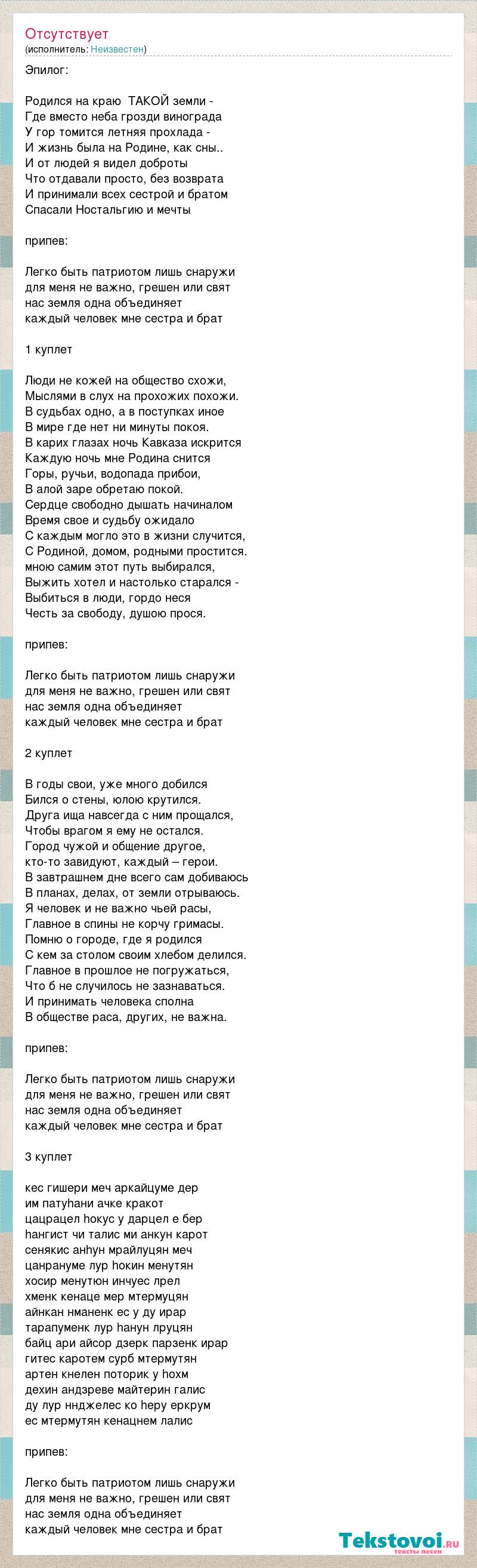 Эпилог: Родился на краю ТАКОЙ земли - Где вместо неба грозди винограда У гор томится летняя прохлада - И жизнь была на Родине, как сны.. И от людей я видел доброты Что отдавали просто, без возврата И принимали всех сестрой и братом Спасали Ностальгию и мечты припев: Легко быть патриотом лишь снаружи для меня не важно, грешен или свят нас земля одна объединяет каждый человек мне сестра и брат 1 куплет Люди не кожей на общество схожи, Мыслями в слух на прохожих похожи. В судьбах одно, а в поступках иное В мире где нет ни минуты покоя. В карих глазах ночь Кавказа искрится Каждую ночь мне Родина снится Горы, ручьи, водопада прибои, В алой заре обретаю покой. Сердце свободно дышать начиналом Время свое и судьбу ожидало С каждым могло это в жизни случится, С Родиной, домом, родными простится. мною самим этот путь выбирался, Выжить хотел и настолько старался - Выбиться в люди, гордо неся Честь за свободу, душою прося. припев: Легко быть патриотом лишь снаружи для меня не важно, грешен или свят нас земля одна объединяет каждый человек мне сестра и брат 2 куплет В годы свои, уже много добился Бился о стены, юлою крутился. Друга ища навсегда с ним прощался, Чтобы врагом я ему не остался. Город чужой и общение другое, кто-то завидуют, каждый – герои. В завтрашнем дне всего сам добиваюсь В планах, делах, от земли отрываюсь. Я человек и не важно чьей расы, Главное в спины не корчу гримасы. Помню о городе, где я родился С кем за столом своим хлебом делился. Главное в прошлое не погружаться, Что б не случилось не зазнаваться. И принимать человека сполна В обществе раса, других, не важна. припев: Легко быть патриотом лишь снаружи для меня не важно, грешен или свят нас земля одна объединяет каждый человек мне сестра и брат 3 куплет кес гишери меч аркайцуме дер им патуhани ачке кракот цацрацел hокус у дарцел е бер hангист чи талис ми анкун карот сенякис анhун мрайлуцян меч цанрануме лур hокин менутян хосир менутюн инчуес лрел хменк кенаце мер мтермуцян айнкан нманенк ес у ду ирар тарапуменк лур hанун лруцян байц ари айсор дзерк парзенк ирар гитес каротем сурб мтермутян артен кнелен поторик у hохм дехин андзреве майтерин галис ду лур ннджелес ко hеру еркрум ес мтермутян кенацнем лалис припев: Легко быть патриотом лишь снаружи для меня не важно, грешен или свят нас земля одна объединяет каждый человек мне сестра и брат