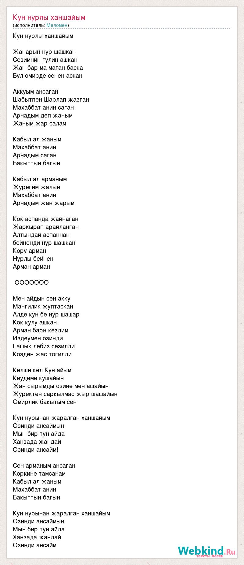 Кун нурлы ханшайым Жанарын нур шашкан Сезимнин гулин ашкан Жан бар ма маган баска Бул омирде сенен аскан Аккуым ансаган Шабытпен Шарлап жазган Махаббат анин саган Арнадым деп жаным Жаным жар салам Кабыл ал жаным Махаббат анин Арнадым саган Бакыттын багын Кабыл ал арманым Журегим жалын Махаббат анин Арнадым жан жарым Кок аспанда жайнаган Жаркырап арайланган Алтындай аспаннан бейненди нур шашкан Кору арман Нурлы бейнен Арман арман ООООООО Мен айдын сен акку Мангилик жуптаскан Алде кун бе нур шашар Кок кулу ашкан Арман барн кездим Издеумен озинди Гашык лебиз сезилди Козден жас тогилди Келши кел Кун айым Кеудеме кушайын Жан сырымды озине мен ашайын Журектен саркылмас жыр шашайын Омирлик бакытым сен Кун нурынан жаралган ханшайым Озинди ансаймын Мын бир тун айда Ханзада жандай Озинди ансайм! Сен арманым ансаган Коркине тамсанам Кабыл ал жаным Махаббат анин Бакыттын багын Кун нурынан жаралган ханшайым Озинди ансаймын Мын бир тун айда Ханзада жандай Озинди ансайм