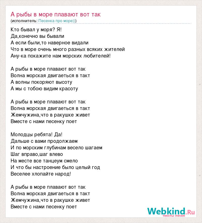 Кто бывал у моря? Я! Да,конечно вы бывали А если были,то наверное видали Что в море очень много разных всяких жителей Ану-ка покажите нам морских любителей! А рыбы в море плавают вот так Волна морская двигаеться в такт А волны покоряют высоту А мы с тобою видим красоту А рыбы в море плавают вот так Волна морская двигаеться в такт Жемчужина,что в ракушке живет Вместе с нами песенку поет Молодцы ребята! Да! Дальше с вами продолжаем И по морским глубинам весело шагаем Шаг вправо,шаг влево На месте все танцеум смело И что бы настроение было целый год Веселее хлопайте народ! А рыбы в море плавают вот так Волна морская двигаеться в такт Жемчужина,что в ракушке живет Вместе с нами песенку поет