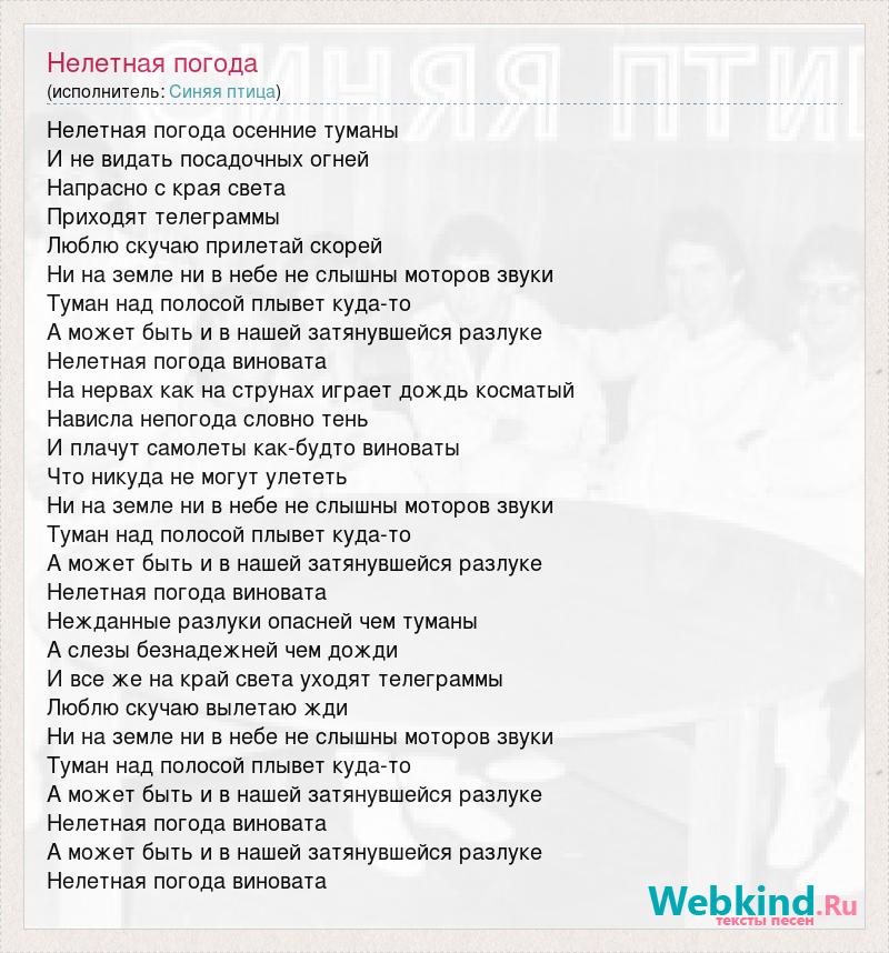Нелетная погода осенние туманы И не видать посадочных огней Напрасно с края света Приходят телеграммы Люблю скучаю прилетай скорей Ни на земле ни в небе не слышны моторов звуки Туман над полосой плывет куда-то А может быть и в нашей затянувшейся разлуке Нелетная погода виновата На нервах как на струнах играет дождь косматый Нависла непогода словно тень И плачут самолеты как-будто виноваты Что никуда не могут улететь Ни на земле ни в небе не слышны моторов звуки Туман над полосой плывет куда-то А может быть и в нашей затянувшейся разлуке Нелетная погода виновата Нежданные разлуки опасней чем туманы А слезы безнадежней чем дожди И все же на край света уходят телеграммы Люблю скучаю вылетаю жди Ни на земле ни в небе не слышны моторов звуки Туман над полосой плывет куда-то А может быть и в нашей затянувшейся разлуке Нелетная погода виновата А может быть и в нашей затянувшейся разлуке Нелетная погода виновата
