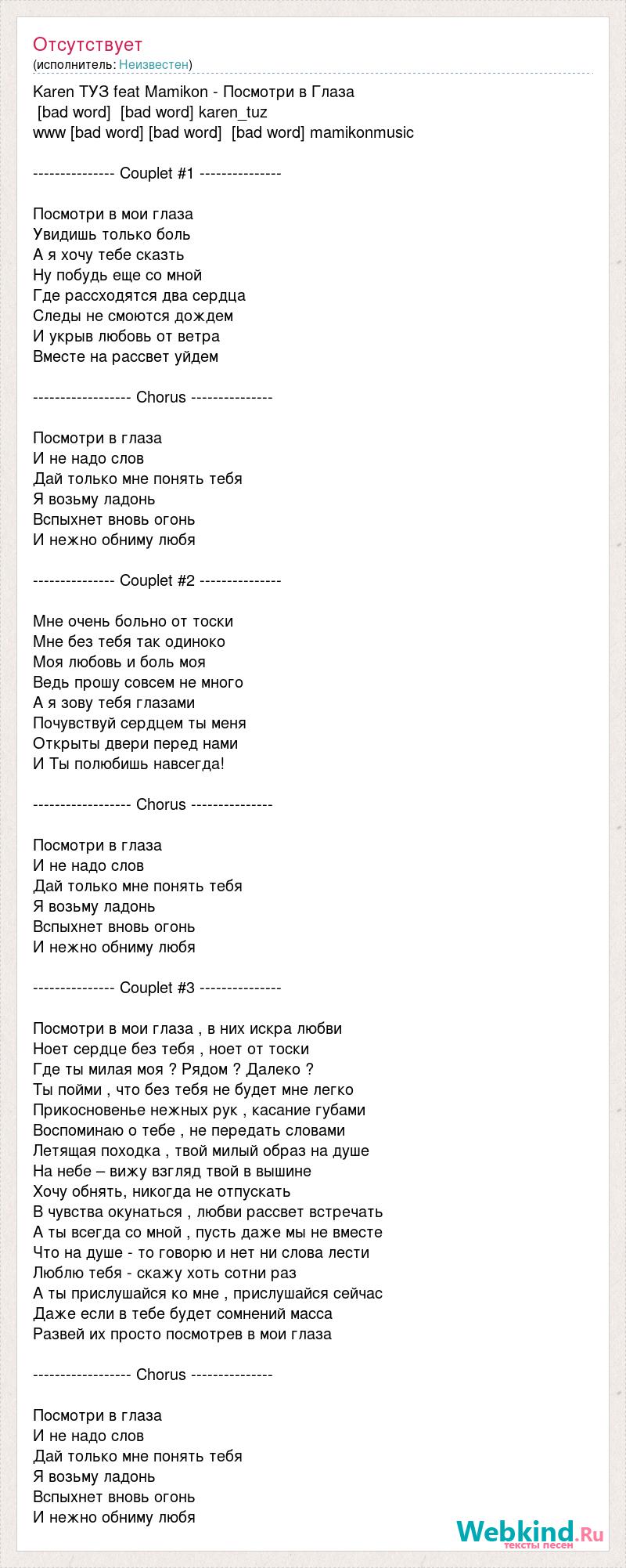Karen ТУЗ feat Mamikon - Посмотри в Глаза [bad word] [bad word] karen_tuz www [bad word] [bad word] [bad word] mamikonmusic --------------- Сouplet #1 --------------- Посмотри в мои глаза Увидишь только боль А я хочу тебе сказть Ну побудь еще со мной Где рассходятся два сердца Следы не смоются дождем И укрыв любовь от ветра Вместе на рассвет уйдем ------------------ Chorus --------------- Посмотри в глаза И не надо слов Дай только мне понять тебя Я возьму ладонь Вспыхнет вновь огонь И нежно обниму любя --------------- Сouplet #2 --------------- Мне очень больно от тоски Мне без тебя так одиноко Моя любовь и боль моя Ведь прошу совсем не много А я зову тебя глазами Почувствуй сердцем ты меня Открыты двери перед нами И Ты полюбишь навсегда! ------------------ Chorus --------------- Посмотри в глаза И не надо слов Дай только мне понять тебя Я возьму ладонь Вспыхнет вновь огонь И нежно обниму любя --------------- Сouplet #3 --------------- Посмотри в мои глаза , в них искра любви Ноет сердце без тебя , ноет от тоски Где ты милая моя ? Рядом ? Далеко ? Ты пойми , что без тебя не будет мне легко Прикосновенье нежных рук , касание губами Воспоминаю о тебе , не передать словами Летящая походка , твой милый образ на душе На небе – вижу взгляд твой в вышине Хочу обнять, никогда не отпускать В чувства окунаться , любви рассвет встречать А ты всегда со мной , пусть даже мы не вместе Что на душе - то говорю и нет ни слова лести Люблю тебя - скажу хоть сотни раз А ты прислушайся ко мне , прислушайся сейчас Даже если в тебе будет сомнений масса Развей их просто посмотрев в мои глаза ------------------ Chorus --------------- Посмотри в глаза И не надо слов Дай только мне понять тебя Я возьму ладонь Вспыхнет вновь огонь И нежно обниму любя