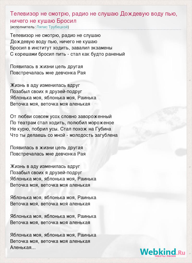 Телевизор не смотрю, радио не слушаю Дождевую воду пью, ничего не кушаю Бросил в институт ходить, завалил экзамены С корешами бросил пить - стал как будто раненый Появилась в жизни цель другая Повстречалась мне девчонка Рая Жизнь в аду изменилась вдруг Позабыл своих я друзей-подруг Яблонька моя, яблонька моя, Раинька Веточка моя, веточка моя аленькая От любви совсем усох словно завороженный По театрам стал ходить, полюбил мороженое Не курю, побрил усы. Стал похож на Губина Что ты делаешь со мной - молодость загублена Появилась в жизни цель другая Повстречалась мне девчонка Рая Жизнь в аду изменилась вдруг Позабыл своих я друзей-подруг Яблонька моя, яблонька моя, Раинька Веточка моя, веточка моя аленькая Яблонька моя, яблонька моя, Раинька Веточка моя, веточка моя аленькая Яблонька моя, яблонька моя, Раинька Веточка моя, веточка моя аленькая Яблонька моя, яблонька моя, Раинька Веточка моя, веточка моя аленькая Аленькая...