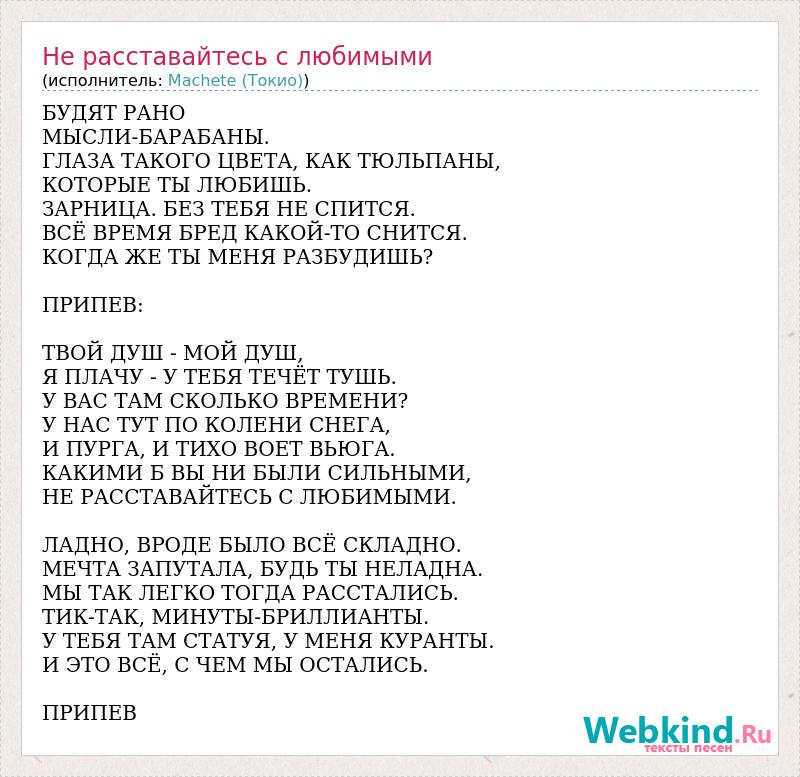 БУДЯТ РАНО МЫСЛИ-БАРАБАНЫ. ГЛАЗА ТАКОГО ЦВЕТА, КАК ТЮЛЬПАНЫ, КОТОРЫЕ ТЫ ЛЮБИШЬ. ЗАРНИЦА. БЕЗ ТЕБЯ НЕ СПИТСЯ. ВСЁ ВРЕМЯ БРЕД КАКОЙ-ТО СНИТСЯ. КОГДА ЖЕ ТЫ МЕНЯ РАЗБУДИШЬ? ПРИПЕВ: ТВОЙ ДУШ - МОЙ ДУШ, Я ПЛАЧУ - У ТЕБЯ ТЕЧЁТ ТУШЬ. У ВАС ТАМ СКОЛЬКО ВРЕМЕНИ? У НАС ТУТ ПО КОЛЕНИ СНЕГА, И ПУРГА, И ТИХО ВОЕТ ВЬЮГА. КАКИМИ Б ВЫ НИ БЫЛИ СИЛЬНЫМИ, НЕ РАССТАВАЙТЕСЬ С ЛЮБИМЫМИ. ЛАДНО, ВРОДЕ БЫЛО ВСЁ СКЛАДНО. МЕЧТА ЗАПУТАЛА, БУДЬ ТЫ НЕЛАДНА. МЫ ТАК ЛЕГКО ТОГДА РАССТАЛИСЬ. ТИК-ТАК, МИНУТЫ-БРИЛЛИАНТЫ. У ТЕБЯ ТАМ СТАТУЯ, У МЕНЯ КУРАНТЫ. И ЭТО ВСЁ, С ЧЕМ МЫ ОСТАЛИСЬ. ПРИПЕВ