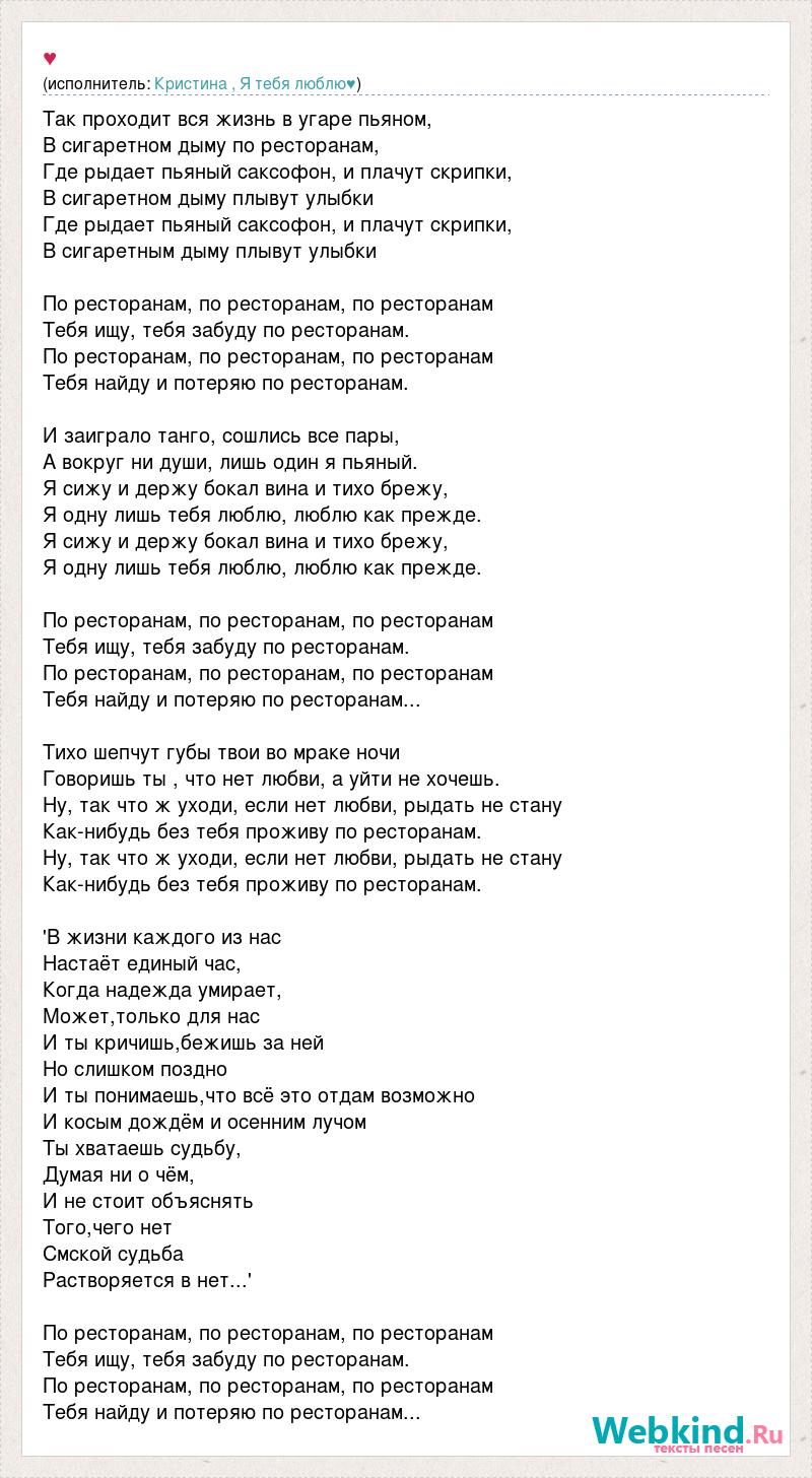 Так проходит вся жизнь в угаре пьяном, В сигаретном дыму по ресторанам, Где рыдает пьяный саксофон, и плачут скрипки, В сигаретном дыму плывут улыбки Где рыдает пьяный саксофон, и плачут скрипки, В сигаретным дыму плывут улыбки По ресторанам, по ресторанам, по ресторанам Тебя ищу, тебя забуду по ресторанам. По ресторанам, по ресторанам, по ресторанам Тебя найду и потеряю по ресторанам. И заиграло танго, сошлись все пары, А вокруг ни души, лишь один я пьяный. Я сижу и держу бокал вина и тихо брежу, Я одну лишь тебя люблю, люблю как прежде. Я сижу и держу бокал вина и тихо брежу, Я одну лишь тебя люблю, люблю как прежде. По ресторанам, по ресторанам, по ресторанам Тебя ищу, тебя забуду по ресторанам. По ресторанам, по ресторанам, по ресторанам Тебя найду и потеряю по ресторанам... Тихо шепчут губы твои во мраке ночи Говоришь ты , что нет любви, а уйти не хочешь. Ну, так что ж уходи, если нет любви, рыдать не стану Как-нибудь без тебя проживу по ресторанам. Ну, так что ж уходи, если нет любви, рыдать не стану Как-нибудь без тебя проживу по ресторанам. 'В жизни каждого из нас Настаёт единый час, Когда надежда умирает, Может,только для нас И ты кричишь,бежишь за ней Но слишком поздно И ты понимаешь,что всё это отдам возможно И косым дождём и осенним лучом Ты хватаешь судьбу, Думая ни о чём, И не стоит объяснять Того,чего нет Смской судьба Растворяется в нет...' По ресторанам, по ресторанам, по ресторанам Тебя ищу, тебя забуду по ресторанам. По ресторанам, по ресторанам, по ресторанам Тебя найду и потеряю по ресторанам...