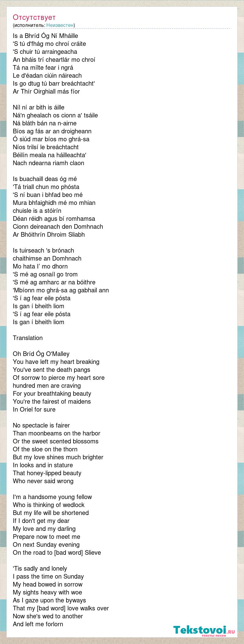 Is a Bhríd Óg Ní Mháille 'S tú d'fhág mo chroí cráite 'S chuir tú arraingeacha An bháis trí cheartlár mo chroí Tá na mílte fear i ngrá Le d'éadan ciúin náireach Is go dtug tú barr breáchtacht' Ar Thír Oirghiall más fíor Níl ní ar bith is áille Ná'n ghealach os cionn a' tsáile Ná bláth bán na n-airne Bíos ag fás ar an droigheann Ó siúd mar bíos mo ghrá-sa Níos trilsí le breáchtacht Béilín meala na háilleachta' Nach ndearna riamh claon Is buachaill deas óg mé 'Tá triall chun mo phósta 'S ní buan i bhfad beo mé Mura bhfaighidh mé mo mhian chuisle is a stóirín Déan réidh agus bí romhamsa Cionn deireanach den Domhnach Ar Bhóithrín Dhroim Sliabh Is tuirseach 's brónach chaithimse an Domhnach Mo hata I mo dhorn 'S mé ag osnaíl go trom 'S mé ag amharc ar na bóithre 'Mbíonn mo ghrá-sa ag gabhail ann 'S í ag fear eile pósta Is gan í bheith liom 'S í ag fear eile pósta Is gan í bheith liom Translation Oh Bríd Óg O'Malley You have left my heart breaking You've sent the death pangs Of sorrow to pierce my heart sore hundred men are craving For your breathtaking beauty You're the fairest of maidens In Oriel for sure No spectacle is fairer Than moonbeams on the harbor Or the sweet scented blossoms Of the sloe on the thorn But my love shines much brighter In looks and in stature That honey-lipped beauty Who never said wrong I'm a handsome young fellow Who is thinking of wedlock But my life will be shortened If I don't get my dear My love and my darling Prepare now to meet me On next Sunday evening On the road to Drum Slieve 'Tis sadly and lonely I pass the time on Sunday My head bowed in sorrow My sights heavy with woe As I gaze upon the byways That my true love walks over Now she's wed to another And left me forlorn