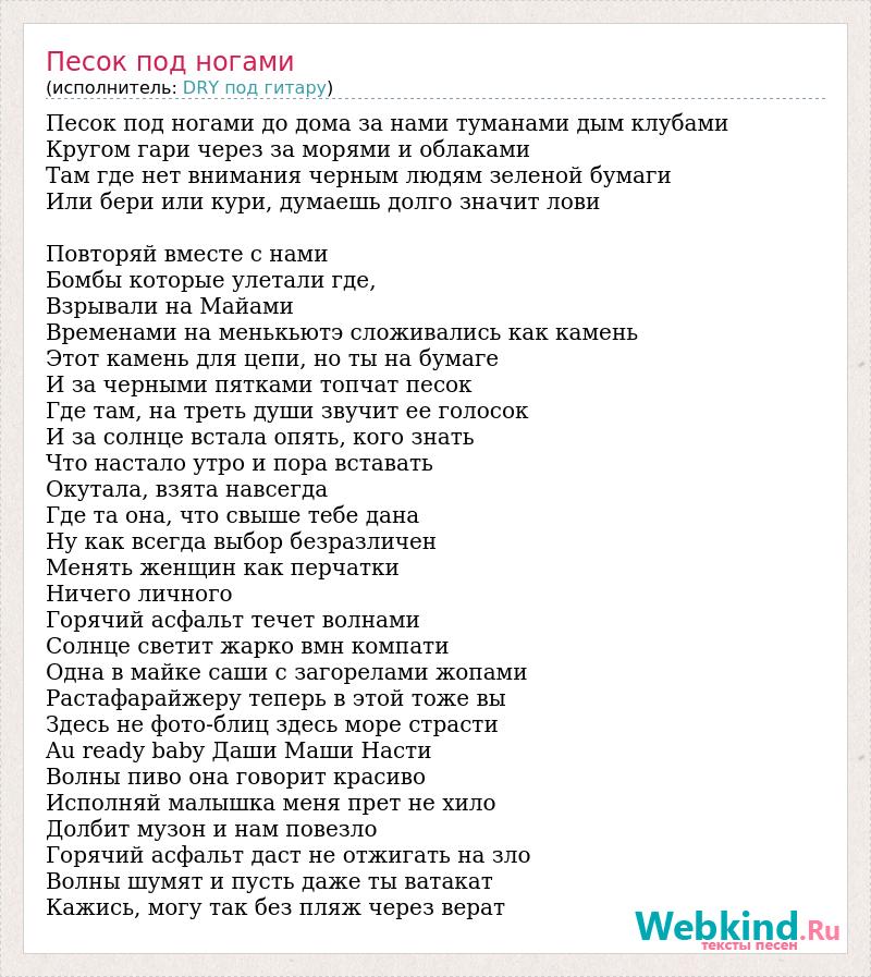 Песок под ногами до дома за нами туманами дым клубами Кругом гари через за морями и облаками Там где нет внимания черным людям зеленой бумаги Или бери или кури, думаешь долго значит лови Повторяй вместе с нами Бомбы которые улетали где, Взрывали на Майами Временами на менькьютэ сложивались как камень Этот камень для цепи, но ты на бумаге И за черными пятками топчат песок Где там, на треть души звучит ее голосок И за солнце встала опять, кого знать Что настало утро и пора вставать Окутала, взята навсегда Где та она, что свыше тебе дана Ну как всегда выбор безразличен Менять женщин как перчатки Ничего личного Горячий асфальт течет волнами Солнце светит жарко вмн компати Одна в майке саши с загорелами жопами Растафарайжеру теперь в этой тоже вы Здесь не фото-блиц здесь море страсти Au ready baby Даши Маши Насти Волны пиво она говорит красиво Исполняй малышка меня прет не хило Долбит музон и нам повезло Горячий асфальт даст не отжигать на зло Волны шумят и пусть даже ты ватакат Кажись, могу так без пляж через верат