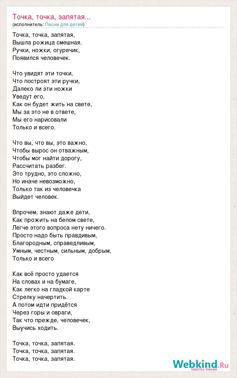 Точка, точка, запятая, Вышла рожица смешная. Ручки, ножки, огуречик, Появился человечек. Что увидят эти точки, Что построят эти ручки, Далеко ли эти ножки Уведут его, Как он будет жить на свете, Мы за это не в ответе, Мы его нарисовали Только и всего. Что вы, что вы, это важно, Чтобы вырос он отважным, Чтобы мог найти дорогу, Рассчитать разбег. Это трудно, это сложно, Но иначе невозможно, Только так из человечка Выйдет человек. Впрочем, знают даже дети, Как прожить на белом свете, Легче этого вопроса нету ничего. Просто надо быть правдивым, Благородным, справедливым, Умным, честным, сильным, добрым, Только и всего Как всё просто удается На словах и на бумаге, Как легко на гладкой карте Стрелку начертить. А потом идти придётся Через горы и овраги, Так что прежде, человечек, Выучись ходить. Точка, точка, запятая. Точка, точка, запятая. Точка, точка, запятая.