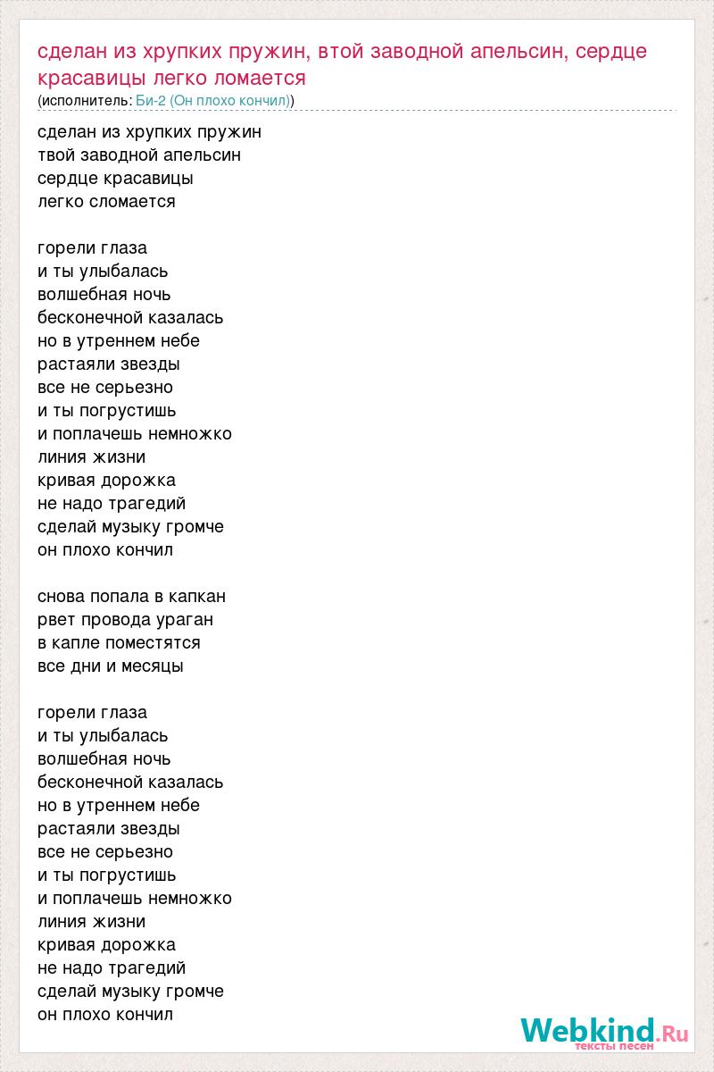 Главная→Исполнители→Би-2 (Он плохо кончил)→Сделан из хрупких пружин, втой заводной апельсин, сердце красавицы легко