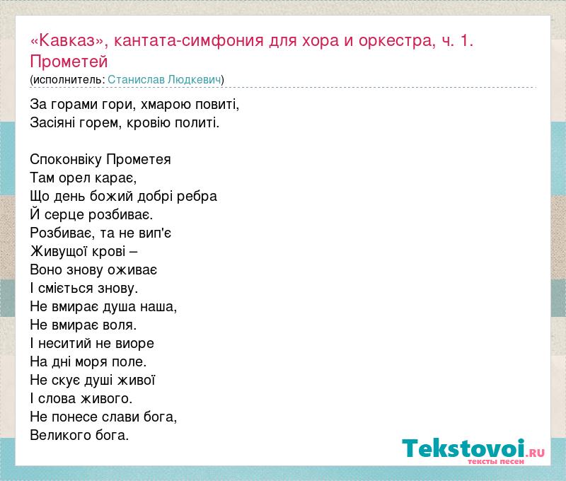 За горами гори, хмарою повиті, Засіяні горем, кровію политі. Споконвіку Прометея Там орел карає, Що день божий добрі ребра Й серце розбиває. Розбиває, та не вип'є Живущої крові – Воно знову оживає І сміється знову. Не вмирає душа наша, Не вмирає воля. І неситий не виоре На дні моря поле. Не скує душі живої І слова живого. Не понесе слави бога, Великого бога.