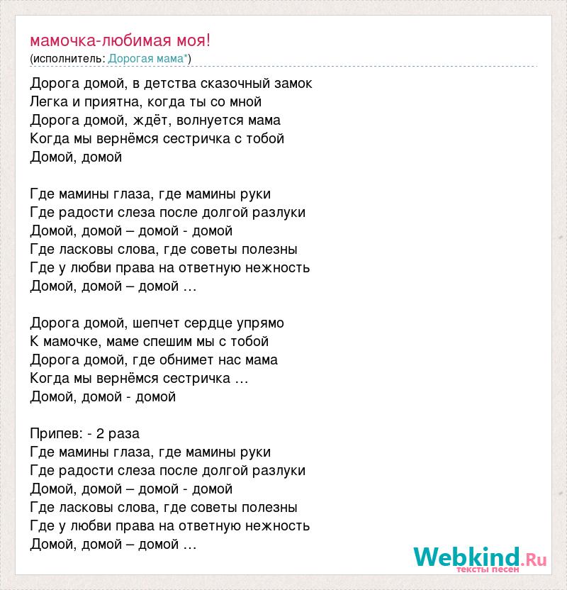 Дорога домой, в детства сказочный замок Легка и приятна, когда ты со мной Дорога домой, ждёт, волнуется мама Когда мы вернёмся сестричка с тобой Домой, домой Где мамины глаза, где мамины руки Где радости слеза после долгой разлуки Домой, домой – домой - домой Где ласковы слова, где советы полезны Где у любви права на ответную нежность Домой, домой – домой … Дорога домой, шепчет сердце упрямо К мамочке, маме спешим мы с тобой Дорога домой, где обнимет нас мама Когда мы вернёмся сестричка … Домой, домой - домой Припев: - 2 раза Где мамины глаза, где мамины руки Где радости слеза после долгой разлуки Домой, домой – домой - домой Где ласковы слова, где советы полезны Где у любви права на ответную нежность Домой, домой – домой …
