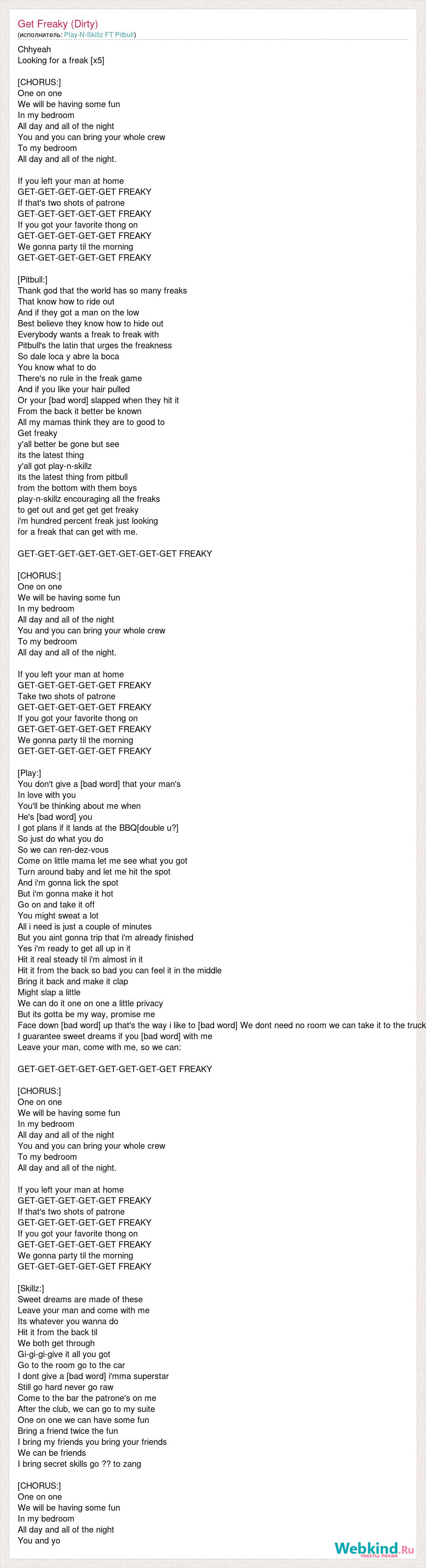 Chhyeah Looking for a freak [x5] [CHORUS:] One on one We will be having some fun In my bedroom All day and all of the night You and you can bring your whole crew To my bedroom All day and all of the night. If you left your man at home GET-GET-GET-GET-GET FREAKY If that's two shots of patrone GET-GET-GET-GET-GET FREAKY If you got your favorite thong on GET-GET-GET-GET-GET FREAKY We gonna party til the morning GET-GET-GET-GET-GET FREAKY [Pitbull:] Thank god that the world has so many freaks That know how to ride out And if they got a man on the low Best believe they know how to hide out Everybody wants a freak to freak with Pitbull's the latin that urges the freakness So dale loca y abre la boca You know what to do There's no rule in the freak game And if you like your hair pulled Or your [bad word] slapped when they hit it From the back it better be known All my mamas think they are to good to Get freaky y'all better be gone but see its the latest thing y'all got play-n-skillz its the latest thing from pitbull from the bottom with them boys play-n-skillz encouraging all the freaks to get out and get get get freaky i'm hundred percent freak just looking for a freak that can get with me. GET-GET-GET-GET-GET-GET-GET-GET FREAKY [CHORUS:] One on one We will be having some fun In my bedroom All day and all of the night You and you can bring your whole crew To my bedroom All day and all of the night. If you left your man at home GET-GET-GET-GET-GET FREAKY Take two shots of patrone GET-GET-GET-GET-GET FREAKY If you got your favorite thong on GET-GET-GET-GET-GET FREAKY We gonna party til the morning GET-GET-GET-GET-GET FREAKY [Play:] You don't give a [bad word] that your man's In love with you You'll be thinking about me when He's [bad word] you I got plans if it lands at the BBQ[double u?] So just do what you do So we can ren-dez-vous Come on little mama let me see what you got Turn around baby and let me hit the spot And i'm gonna lick the spot But i'm gonna make it hot Go on and take it off You might sweat a lot All i need is just a couple of minutes But you aint gonna trip that i'm already finished Yes i'm ready to get all up in it Hit it real steady til i'm almost in it Hit it from the back so bad you can feel it in the middle Bring it back and make it clap Might slap a little We can do it one on one a little privacy But its gotta be my way, promise me Face down [bad word] up that's the way i like to [bad word] We dont need no room we can take it to the truck I guarantee sweet dreams if you [bad word] with me Leave your man, come with me, so we can: GET-GET-GET-GET-GET-GET-GET-GET FREAKY [CHORUS:] One on one We will be having some fun In my bedroom All day and all of the night You and you can bring your whole crew To my bedroom All day and all of the night. If you left your man at home GET-GET-GET-GET-GET FREAKY If that's two shots of patrone GET-GET-GET-GET-GET FREAKY If you got your favorite thong on GET-GET-GET-GET-GET FREAKY We gonna party til the morning GET-GET-GET-GET-GET FREAKY [Skillz:] Sweet dreams are made of these Leave your man and come with me Its whatever you wanna do Hit it from the back til We both get through Gi-gi-gi-give it all you got Go to the room go to the car I dont give a [bad word] i'mma superstar Still go hard never go raw Come to the bar the patrone's on me After the club, we can go to my suite One on one we can have some fun Bring a friend twice the fun I bring my friends you bring your friends We can be friends I bring secret skills go ?? to zang [CHORUS:] One on one We will be having some fun In my bedroom All day and all of the night You and yo