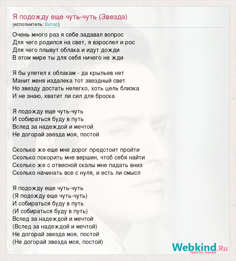 Очень много раз я себе задавал вопрос Для чего родился на свет, я взрослел и рос Для чего плывут облака и идут дожди В этом мире ты для себя ничего не жди Я бы улетел к облакам - да крыльев нет Манит меня издалека тот звездный свет Но звезду достать нелегко, хоть цель близка И не знаю, хватит ли сил для броска Я подожду еще чуть-чуть И собираться буду в путь Вслед за надеждой и мечтой Не догорай звезда моя, постой Сколько же еще мне дорог предстоит пройти Сколько покорить мне вершин, чтоб себя найти Сколько же с отвесной скалы мне падать вниз Сколько начинать все с нуля, и есть ли смысл Я подожду еще чуть-чуть (Я подожду еще чуть-чуть) И собираться буду в путь (И собираться буду в путь) Вслед за надеждой и мечтой (Вслед за надеждой и мечтой) Не догорай звезда моя, постой (Не догорай звезда моя, постой)