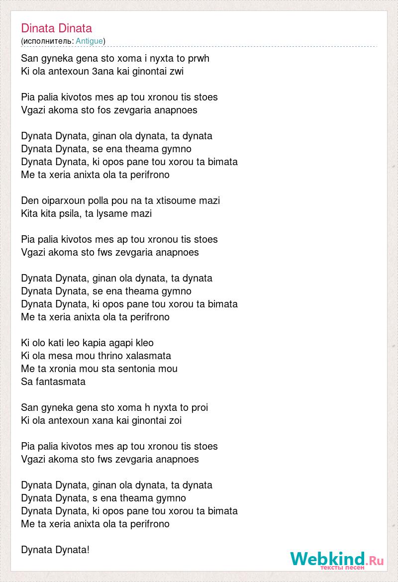 San gyneka gena sto xoma i nyxta to prwh Ki ola antexoun 3ana kai ginontai zwi Pia palia kivotos mes ap tou xronou tis stoes Vgazi akoma sto fos zevgaria anapnoes Dynata Dynata, ginan ola dynata, ta dynata Dynata Dynata, se ena theama gymno Dynata Dynata, ki opos pane tou xorou ta bimata Me ta xeria anixta ola ta perifrono Den oiparxoun polla pou na ta xtisoume mazi Kita kita psila, ta lysame mazi Pia palia kivotos mes ap tou xronou tis stoes Vgazi akoma sto fws zevgaria anapnoes Dynata Dynata, ginan ola dynata, ta dynata Dynata Dynata, se ena theama gymno Dynata Dynata, ki opos pane tou xorou ta bimata Me ta xeria anixta ola ta perifrono Ki olo kati leo kapia agapi kleo Ki ola mesa mou thrino xalasmata Me ta xronia mou sta sentonia mou Sa fantasmata San gyneka gena sto xoma h nyxta to proi Ki ola antexoun xana kai ginontai zoi Pia palia kivotos mes ap tou xronou tis stoes Vgazi akoma sto fws zevgaria anapnoes Dynata Dynata, ginan ola dynata, ta dynata Dynata Dynata, s ena theama gymno Dynata Dynata, ki opos pane tou xorou ta bimata Me ta xeria anixta ola ta perifrono Dynata Dynata!