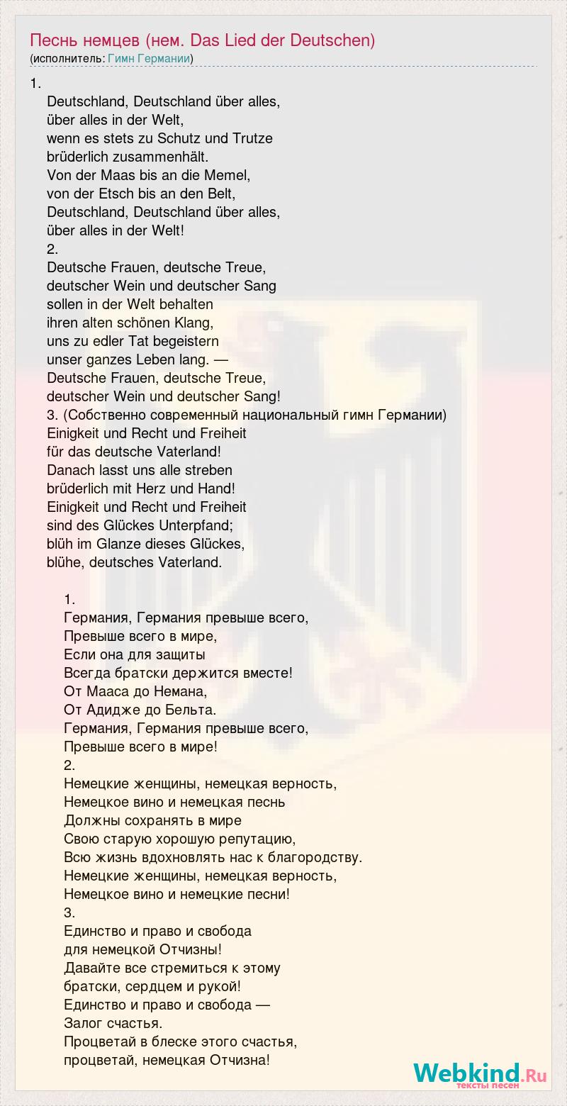 Гимн Германии представляет собой музыку Йозефа Гайдна в сочетании со стихами Гоффманна фон Фаллерслебена. Изначально мелодия Гайдна, сочинённая ещё в 1797 г., называлась «Песнь кайзера» (Kaiserlied) и посвящалась австрийскому императору Францу II (см. гимн Австро-Венгрии). Фаллерслебен написал стихи «Германия превыше всего» в 1841 г.В 1952 г. третий куплет «Песни немцев» (исполнялся... подробнее