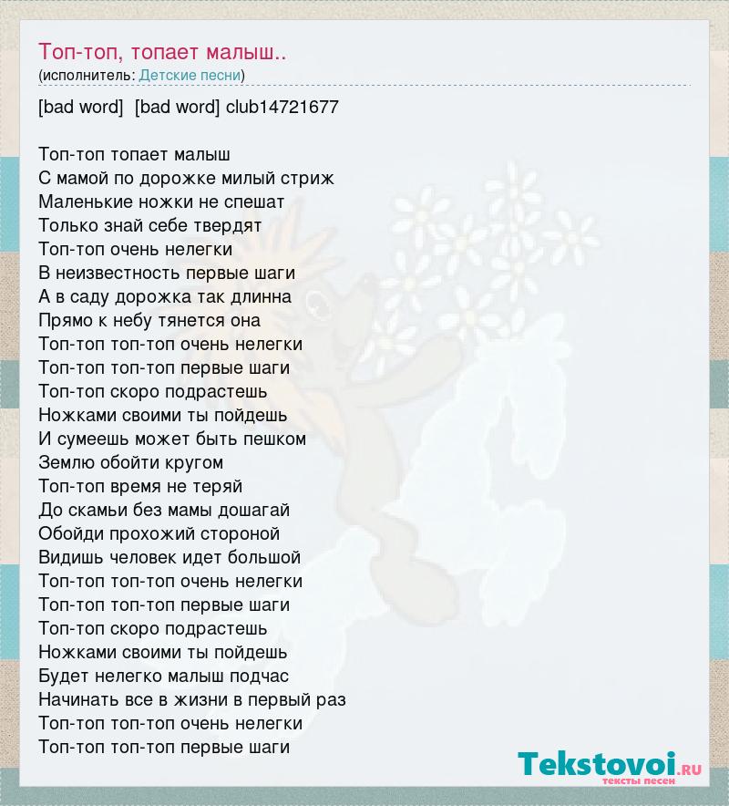 [bad word] [bad word] club14721677 Топ-топ топает малыш С мамой по дорожке милый стриж Маленькие ножки не спешат Только знай себе твердят Топ-топ очень нелегки В неизвестность первые шаги А в саду дорожка так длинна Прямо к небу тянется она Топ-топ топ-топ очень нелегки Топ-топ топ-топ первые шаги Топ-топ скоро подрастешь Ножками своими ты пойдешь И сумеешь может быть пешком Землю обойти кругом Топ-топ время не теряй До скамьи без мамы дошагай Обойди прохожий стороной Видишь человек идет большой Топ-топ топ-топ очень нелегки Топ-топ топ-топ первые шаги Топ-топ скоро подрастешь Ножками своими ты пойдешь Будет нелегко малыш подчас Начинать все в жизни в первый раз Топ-топ топ-топ очень нелегки Топ-топ топ-топ первые шаги
