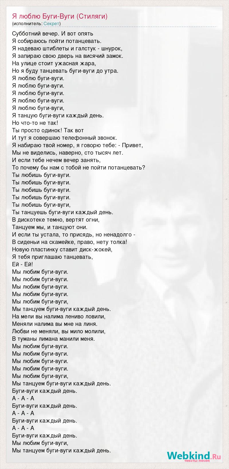 Cубботний вечер. И вот опять Я собираюсь пойти потанцевать. Я надеваю штиблеты и галстук - шнурок, Я запираю свою дверь на висячий замок. На улице стоит ужасная жара, Но я буду танцевать буги-вуги до утра. Я люблю буги-вуги. Я люблю буги-вуги. Я люблю буги-вуги. Я люблю буги-вуги. Я люблю буги-вуги, Я танцую буги-вуги каждый день. Но что-то не так! Ты просто одинок! Так вот И тут я совершаю телефонный звонок. Я набираю твой номер, я говорю тебе: - Привет, Мы не виделись, наверно, сто тысяч лет. И если тебе нечем вечер занять, То почему бы нам с тобой не пойти потанцевать? Ты любишь буги-вуги. Ты любишь буги-вуги. Ты любишь буги-вуги. Ты любишь буги-вуги. Ты любишь буги-вуги, Ты танцуешь буги-вуги каждый день. В дискотеке темно, вертят огни, Танцуем мы, и танцуют они. И если ты устала, то присядь, но ненадолго - В сиденьи на скамейке, право, нету толка! Новую пластинку ставит диск-жокей, Я тебя приглашаю танцевать, Ей - Ей! Мы любим буги-вуги. Мы любим буги-вуги. Мы любим буги-вуги. Мы любим буги-вуги. Мы любим буги-вуги, Мы танцуем буги-вуги каждый день. На мели вы налима лениво ловили, Меняли налима вы мне на линя. Любви не меняли, вы мило молили, В туманы лимана манили меня. Мы любим буги-вуги. Мы любим буги-вуги. Мы любим буги-вуги. Мы любим буги-вуги. Мы любим буги-вуги, Мы танцуем буги-вуги каждый день. Буги-вуги каждый день. А - А - А Буги-вуги каждый день. А - А - А Буги-вуги каждый день. А - А - А Буги-вуги каждый день. Мы любим буги-вуги, Мы танцуем буги-вуги каждый день.