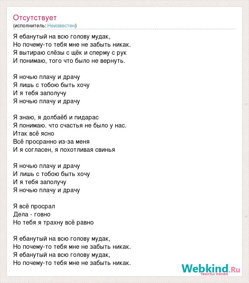 Я ебанутый на всю голову мудак, Но почему-то тебя мне не забыть никак. Я вытираю слёзы с щёк и сперму с рук И понимаю, того что было не вернуть. Я ночью плачу и драчу Я лишь с тобою быть хочу И я тебя заполучу Я ночью плачу и драчу Я знаю, я долбаёб и пидарас Я понимаю. что счастья не было у нас. Итак всё ясно Всё просранно из-за меня И я согласен, я похотливая свинья Я ночью плачу и драчу И лишь с тобою быть хочу И я тебя заполучу Я ночью плачу и драчу Я всё просрал Дела - говно Но тебя я трахну всё равно Я ебанутый на всю голову мудак, Но почему-то тебя мне не забыть никак. Я ебанутый на всю голову мудак, Но почему-то тебя мне не забыть никак.