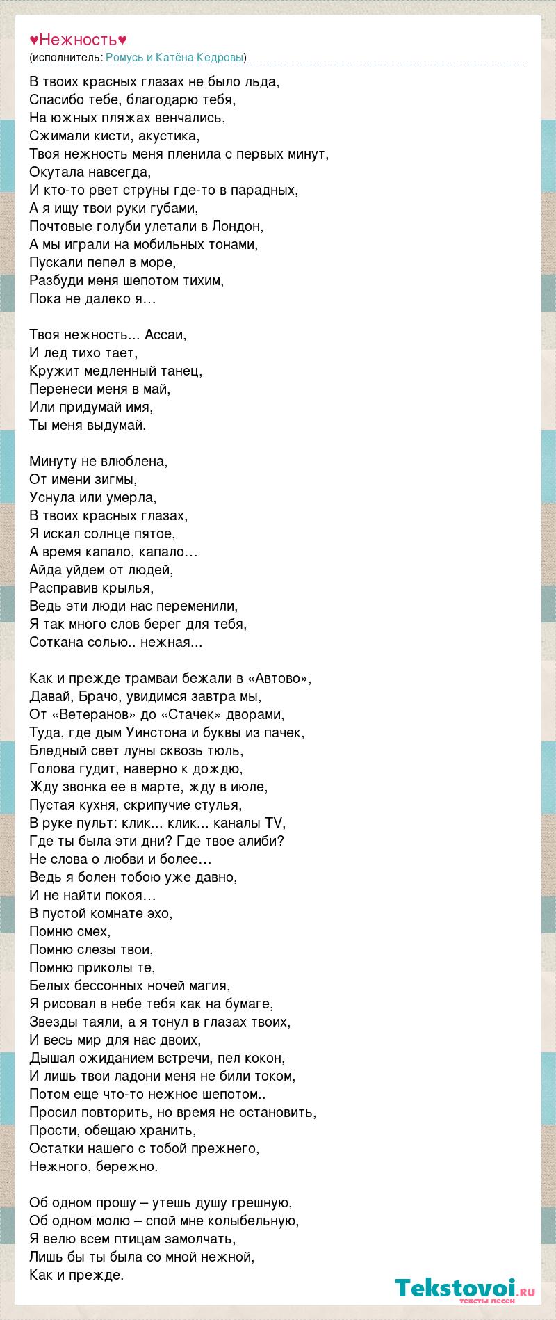 В твоих красных глазах не было льда, Спасибо тебе, благодарю тебя, На южных пляжах венчались, Сжимали кисти, акустика, Твоя нежность меня пленила с первых минут, Окутала навсегда, И кто-то рвет струны где-то в парадных, А я ищу твои руки губами, Почтовые голуби улетали в Лондон, А мы играли на мобильных тонами, Пускали пепел в море, Разбуди меня шепотом тихим, Пока не далеко я… Твоя нежность... Ассаи, И лед тихо тает, Кружит медленный танец, Перенеси меня в май, Или придумай имя, Ты меня выдумай. Минуту не влюблена, От имени зигмы, Уснула или умерла, В твоих красных глазах, Я искал солнце пятое, А время капало, капало… Айда уйдем от людей, Расправив крылья, Ведь эти люди нас переменили, Я так много слов берег для тебя, Соткана солью.. нежная... Как и прежде трамваи бежали в «Автово», Давай, Брачо, увидимся завтра мы, От «Ветеранов» до «Стачек» дворами, Туда, где дым Уинстона и буквы из пачек, Бледный свет луны сквозь тюль, Голова гудит, наверно к дождю, Жду звонка ее в марте, жду в июле, Пустая кухня, скрипучие стулья, В руке пульт: клик... клик... каналы TV, Где ты была эти дни? Где твое алиби? Не слова о любви и более… Ведь я болен тобою уже давно, И не найти покоя… В пустой комнате эхо, Помню смех, Помню слезы твои, Помню приколы те, Белых бессонных ночей магия, Я рисовал в небе тебя как на бумаге, Звезды таяли, а я тонул в глазах твоих, И весь мир для нас двоих, Дышал ожиданием встречи, пел кокон, И лишь твои ладони меня не били током, Потом еще что-то нежное шепотом.. Просил повторить, но время не остановить, Прости, обещаю хранить, Остатки нашего с тобой прежнего, Нежного, бережно. Об одном прошу – утешь душу грешную, Об одном молю – спой мне колыбельную, Я велю всем птицам замолчать, Лишь бы ты была со мной нежной, Как и прежде.