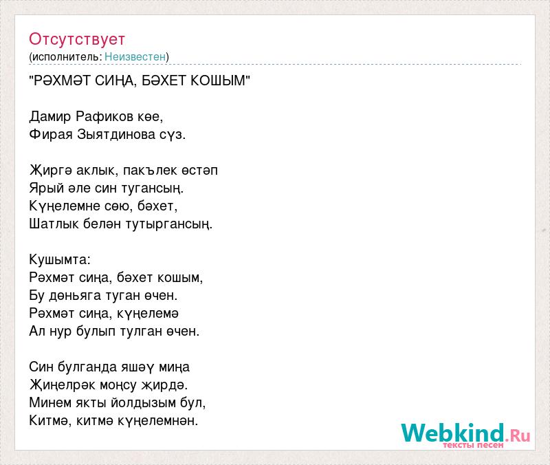 "РӘХМӘТ СИҢА, БӘХЕТ КОШЫМ" Дамир Рафиков көе, Фирая Зыятдинова сүз. Җиргә аклык, пакълек өстәп Ярый әле син тугансың. Күңелемне сөю, бәхет, Шатлык белән тутыргансың. Кушымта: Рәхмәт сиңа, бәхет кошым, Бу дөньяга туган өчен. Рәхмәт сиңа, күңелемә Ал нур булып тулган өчен. Син булганда яшәү миңа Җиңелрәк моңсу җирдә. Минем якты йолдызым бул, Китмә, китмә күңелемнән.