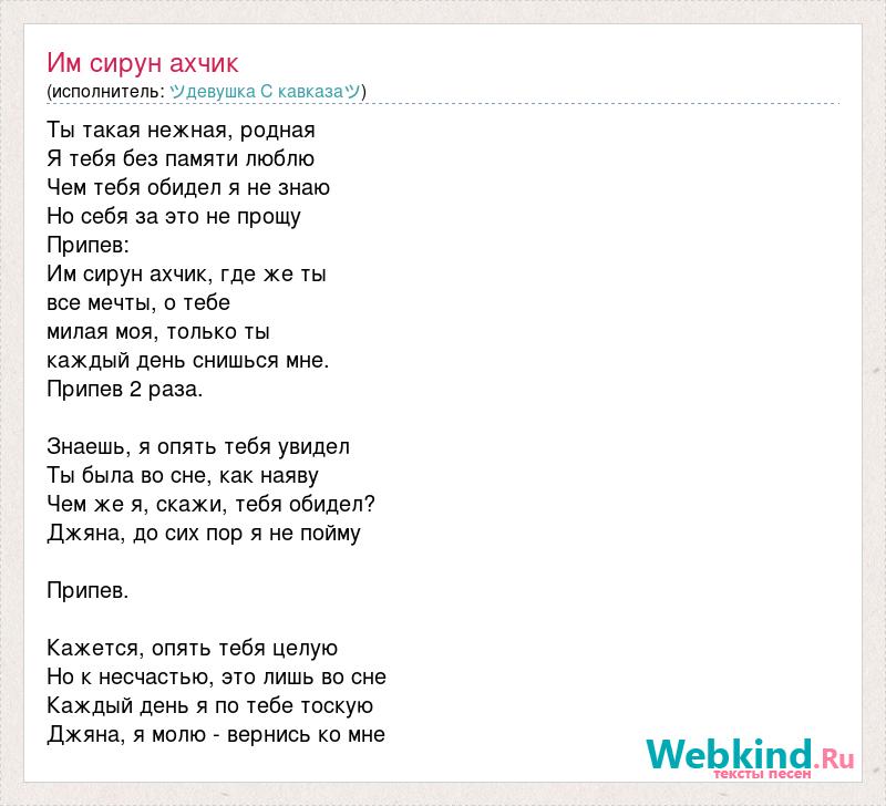 Ты такая нежная, родная Я тебя без памяти люблю Чем тебя обидел я не знаю Но себя за это не прощу Припев: Им сирун ахчик, где же ты все мечты, о тебе милая моя, только ты каждый день снишься мне. Припев 2 раза. Знаешь, я опять тебя увидел Ты была во сне, как наяву Чем же я, скажи, тебя обидел? Джяна, до сих пор я не пойму Припев. Кажется, опять тебя целую Но к несчастью, это лишь во сне Каждый день я по тебе тоскую Джяна, я молю - вернись ко мне