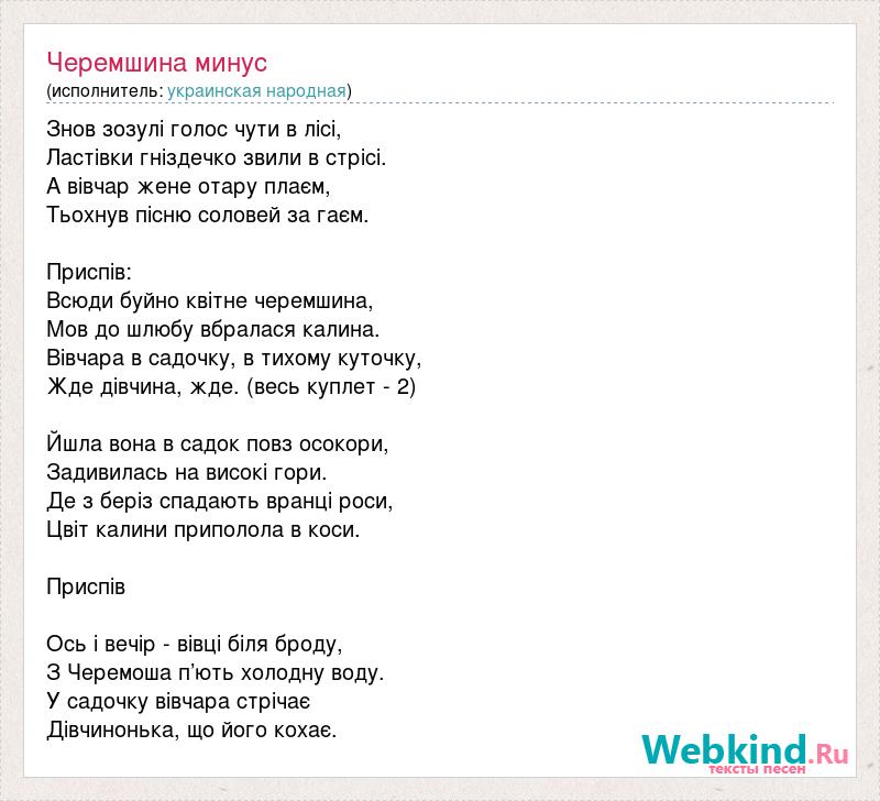Знов зозулі голос чути в лісі, Ластівки гніздечко звили в стрісі. А вівчар жене отару плаєм, Тьохнув пісню соловей за гаєм. Приспів: Всюди буйно квітне черемшина, Мов до шлюбу вбралася калина. Вівчара в садочку, в тихому куточку, Жде дівчина, жде. (весь куплет - 2) Йшла вона в садок повз осокори, Задивилась на високі гори. Де з беріз спадають вранці роси, Цвіт калини приполола в коси. Приспів Ось і вечір - вівці біля броду, З Черемоша п’ють холодну воду. У садочку вівчара стрічає Дівчинонька, що його кохає.