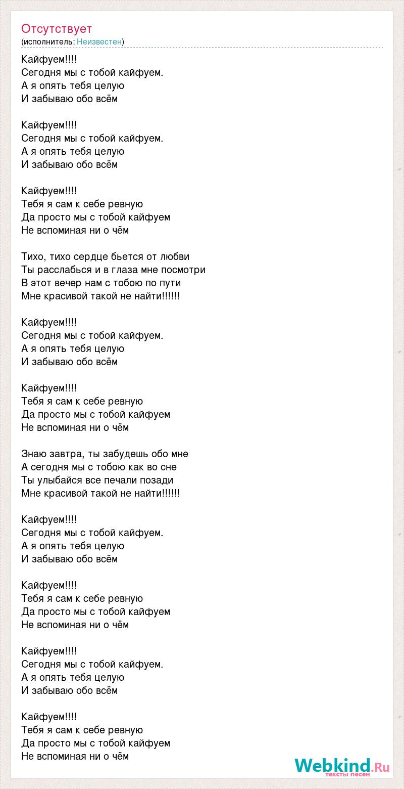 Кайфуем!!!! Сегодня мы с тобой кайфуем. А я опять тебя целую И забываю обо всём Кайфуем!!!! Сегодня мы с тобой кайфуем. А я опять тебя целую И забываю обо всём Кайфуем!!!! Тебя я сам к себе ревную Да просто мы с тобой кайфуем Не вспоминая ни о чём Тихо, тихо сердце бьется от любви Ты расслабься и в глаза мне посмотри В этот вечер нам с тобою по пути Мне красивой такой не найти!!!!!! Кайфуем!!!! Сегодня мы с тобой кайфуем. А я опять тебя целую И забываю обо всём Кайфуем!!!! Тебя я сам к себе ревную Да просто мы с тобой кайфуем Не вспоминая ни о чём Знаю завтра, ты забудешь обо мне А сегодня мы с тобою как во сне Ты улыбайся все печали позади Мне красивой такой не найти!!!!!! Кайфуем!!!! Сегодня мы с тобой кайфуем. А я опять тебя целую И забываю обо всём Кайфуем!!!! Тебя я сам к себе ревную Да просто мы с тобой кайфуем Не вспоминая ни о чём Кайфуем!!!! Сегодня мы с тобой кайфуем. А я опять тебя целую И забываю обо всём Кайфуем!!!! Тебя я сам к себе ревную Да просто мы с тобой кайфуем Не вспоминая ни о чём