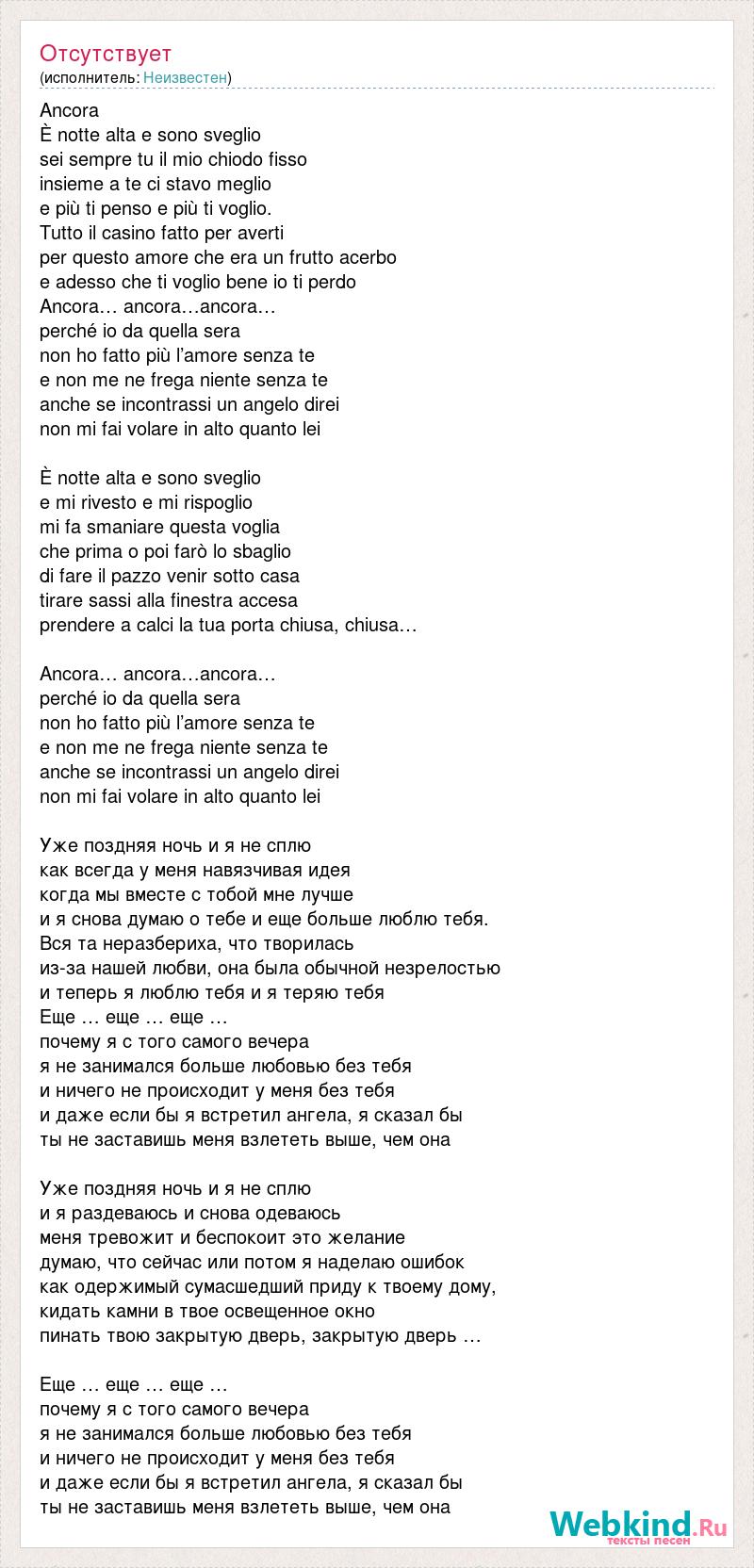 Ancora È notte alta e sono sveglio sei sempre tu il mio chiodo fisso insieme a te ci stavo meglio e più ti penso e più ti voglio. Tutto il casino fatto per averti per questo amore che era un frutto acerbo e adesso che ti voglio bene io ti perdo Ancora… ancora…ancora… perché io da quella sera non ho fatto più l’amore senza te e non me ne frega niente senza te anche se incontrassi un angelo direi non mi fai volare in alto quanto lei È notte alta e sono sveglio e mi rivesto e mi rispoglio mi fa smaniare questa voglia che prima o poi farò lo sbaglio di fare il pazzo venir sotto casa tirare sassi alla finestra accesa prendere a calci la tua porta chiusa, chiusa… Ancora… ancora…ancora… perché io da quella sera non ho fatto più l’amore senza te e non me ne frega niente senza te anche se incontrassi un angelo direi non mi fai volare in alto quanto lei Уже поздняя ночь и я не сплю как всегда у меня навязчивая идея когда мы вместе с тобой мне лучше и я снова думаю о тебе и еще больше люблю тебя. Вся та неразбериха, что творилась из-за нашей любви, она была обычной незрелостью и теперь я люблю тебя и я теряю тебя Еще … еще … еще … почему я с того самого вечера я не занимался больше любовью без тебя и ничего не происходит у меня без тебя и даже если бы я встретил ангела, я сказал бы ты не заставишь меня взлететь выше, чем она Уже поздняя ночь и я не сплю и я раздеваюсь и снова одеваюсь меня тревожит и беспокоит это желание думаю, что сейчас или потом я наделаю ошибок как одержимый сумасшедший приду к твоему дому, кидать камни в твое освещенное окно пинать твою закрытую дверь, закрытую дверь … Еще … еще … еще … почему я с того самого вечера я не занимался больше любовью без тебя и ничего не происходит у меня без тебя и даже если бы я встретил ангела, я сказал бы ты не заставишь меня взлететь выше, чем она