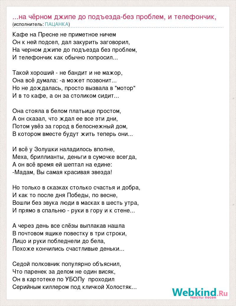 Главная→Исполнители→ПАЦАНКА→...на чёрном джипе до подъезда-без проблем, и телефончик, как обычно попроси