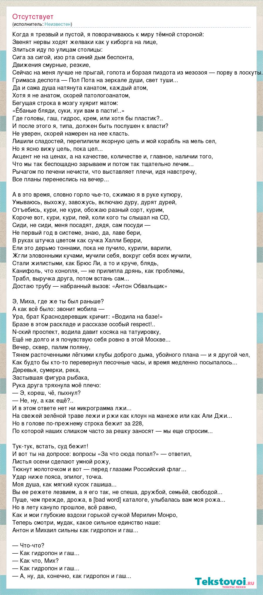 Когда я трезвый и пустой, я поворачиваюсь к миру тёмной стороной: Звенят нервы ходят желваки как у киборга на лице, Злиться иду по улицам столицы: Сига за сигой, изо рта синий дым беспонта, Движения смурные, резкие, Сейчас на меня лучше не прыгай, гопота и борзая пиздота из мезозоя — порву в лоскуты. Гримаса деспота — Пол Пота на зеркале души, свет туши... Да и сама душа натянута канатом, каждый атом, Хотя я не анатом, скорей патологоанатом, Бегущая строка в мозгу хуярит матом: «Ёбаные бляди, суки, хуи вам в пасти!..» Где головы, гаш, гидрос, крем, или хотя бы пластик?.. И после этого я, типа, должен быть послушен к власти? Не уверен, скорей намерен на нее класть. Лишили сладостей, перепилили якорную цепь и мой корабль на мель сел, Но я ясно вижу цель, пока цел... Акцент не на ценах, а на качестве, количестве и, главное, наличии того, Что мы так беспощадно зарываем и потом так тщательно лечим... Рычагом по печени нечисти, что выставляет плечи, идя навстречу, Все планы перенеслись на вечер... А в это время, словно горло чье-то, сжимаю я в руке купюру, Умываюсь, выхожу, завожусь, включаю дуру, дурят дурей, Отъебись, кури, не кури, обожаю разный сорт, курим, Короче вот, кури, кури, пей, коли кого ты слышал на CD, Сиди, не сиди, меня посадят, дядя, сам посуди — Не первый год в системе, знаю, да, лаве бери, В руках штучка цветом как сучка Халли Берри, Ели это дерьмо тоннами, пока не пучило, курили, варили, Жгли зловонными кучами, мучили себя, вокруг себя всех мучили, Стали жилистыми, как Брюс Ли, а то и круче, блядь, Канифоль, что конопля, — не прилипла дрянь, как проблемы, Трабл, выручка друга, потом встань сам... Достаю трубу — набранный вызов: «Антон Обвальщик» Э, Миха, где же ты был раньше? А как всё было: звонит мобила — Ура, брат Краснодеревщик кричит: «Водила на базе!» Бразе в этом раскладе и рассказе особый respect!.. N-ский проспект, водила давит косяка на татуировку, Ещё не долго и я почувствую себя ровно в этой Москве... Вечер, сквер, палим поляну, Тянем расточенными лёгкими клубы доброго дыма, убойного плана — и я другой чел, Как будто бы кто-то перевернул песочные часы, и время медленно посыпалось... Деревья, сумерки, река, Застывшая фигура рыбака, Рука друга тряхнула моё плечо: — Э, кореш, чё, пыхнул? — Не, ну, а как ещё?.. И в этом ответе нет ни микрограмма лжи... На свежей зелёной траве лежи и ржи как клоун на манеже или как Али Джи... Но в голове по-прежнему строка бежит за 228, По которой наших слишком часто за решку заносят — мы еще спросим... Тук-тук, встать, суд бежит! И вот ты на допросе: вопросы «За что сюда попал?» — ответил, Листья осени сделают умной рожу, Тюкнут молоточком и вот — перед глазами Российский флаг... Удар ниже пояса, эпилог, точка. Моя душа, как мягкий кусок гашиша... Вы ее режете лезвием, а я его так, не спеша, дружбой, семьёй, свободой... Пуще, чем прежде, дрожа, в [bad word] каталоге, улыбалась вам моя рожа... Но в лету кануло прошлое, всё равно, Как и мои глубокие вздохи горькой сучкой Мерилин Монро, Теперь смотри, мудак, какое сильное единство наше: Антон и Михаил сильны как гидропон и гаш... — Что-что? — Как гидропон и гаш... — Как что, Мих? — Как гидропон и гаш... — А, ну, да, конечно, как гидропон и гаш...