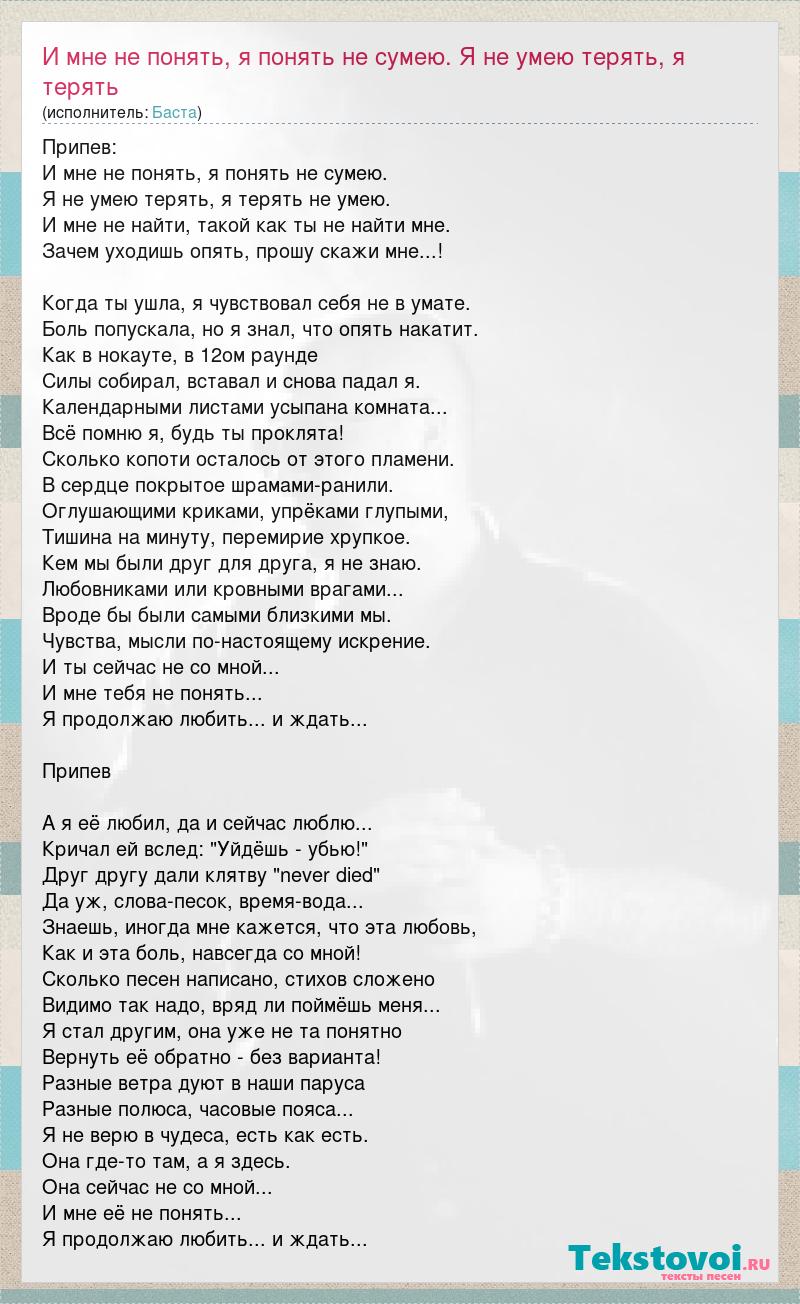 Припев: И мне не понять, я понять не сумею. Я не умею терять, я терять не умею. И мне не найти, такой как ты не найти мне. Зачем уходишь опять, прошу скажи мне...! Когда ты ушла, я чувствовал себя не в умате. Боль попускала, но я знал, что опять накатит. Как в нокауте, в 12ом раунде Силы собирал, вставал и снова падал я. Календарными листами усыпана комната... Всё помню я, будь ты проклята! Сколько копоти осталось от этого пламени. В сердце покрытое шрамами-ранили. Оглушающими криками, упрёками глупыми, Тишина на минуту, перемирие хрупкое. Кем мы были друг для друга, я не знаю. Любовниками или кровными врагами... Вроде бы были самыми близкими мы. Чувства, мысли по-настоящему искрение. И ты сейчас не со мной... И мне тебя не понять... Я продолжаю любить... и ждать... Припев А я её любил, да и сейчас люблю... Кричал ей вслед: "Уйдёшь - убью!" Друг другу дали клятву "never died" Да уж, слова-песок, время-вода... Знаешь, иногда мне кажется, что эта любовь, Как и эта боль, навсегда со мной! Сколько песен написано, стихов сложено Видимо так надо, вряд ли поймёшь меня... Я стал другим, она уже не та понятно Вернуть её обратно - без варианта! Разные ветра дуют в наши паруса Разные полюса, часовые пояса... Я не верю в чудеса, есть как есть. Она где-то там, а я здесь. Она сейчас не со мной... И мне её не понять... Я продолжаю любить... и ждать...