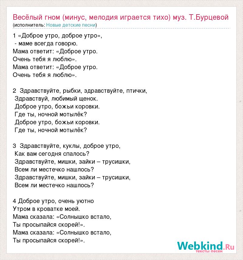 1 «Доброе утро, доброе утро», - маме всегда говорю. Мама ответит: «Доброе утро. Очень тебя я люблю». Мама ответит: «Доброе утро. Очень тебя я люблю». 2 Здравствуйте, рыбки, здравствуйте, птички, Здравствуй, любимый щенок. Доброе утро, божьи коровки. Где ты, ночной мотылёк? Доброе утро, божьи коровки. Где ты, ночной мотылёк? 3 Здравствуйте, куклы, доброе утро, Как вам сегодня спалось? Здравствуйте, мишки, зайки – трусишки, Всем ли местечко нашлось? Здравствуйте, мишки, зайки – трусишки, Всем ли местечко нашлось? 4 Доброе утро, очень уютно Утром в кроватке моей. Мама сказала: «Солнышко встало, Ты просыпайся скорей!». Мама сказала: «Солнышко встало, Ты просыпайся скорей!».