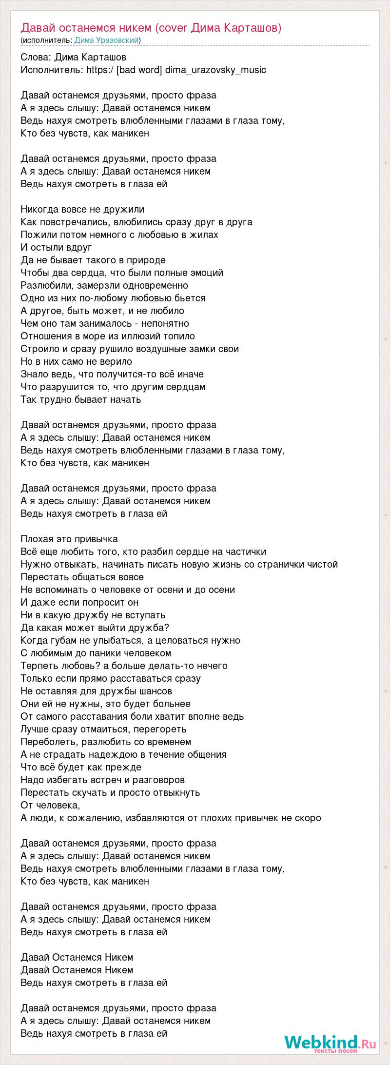 Слова: Дима Карташов Исполнитель: https:/ [bad word] dima_urazovsky_music Давай останемся друзьями, просто фраза А я здесь слышу: Давай останемся никем Ведь нахуя смотреть влюбленными глазами в глаза тому, Кто без чувств, как маникен Давай останемся друзьями, просто фраза А я здесь слышу: Давай останемся никем Ведь нахуя смотреть в глаза ей Никогда вовсе не дружили Как повстречались, влюбились сразу друг в друга Пожили потом немного с любовью в жилах И остыли вдруг Да не бывает такого в природе Чтобы два сердца, что были полные эмоций Разлюбили, замерзли одновременно Одно из них по-любому любовью бьется А другое, быть может, и не любило Чем оно там занималось - непонятно Отношения в море из иллюзий топило Строило и сразу рушило воздушные замки свои Но в них само не верило Знало ведь, что получится-то всё иначе Что разрушится то, что другим сердцам Так трудно бывает начать Давай останемся друзьями, просто фраза А я здесь слышу: Давай останемся никем Ведь нахуя смотреть влюбленными глазами в глаза тому, Кто без чувств, как маникен Давай останемся друзьями, просто фраза А я здесь слышу: Давай останемся никем Ведь нахуя смотреть в глаза ей Плохая это привычка Всё еще любить того, кто разбил сердце на частички Нужно отвыкать, начинать писать новую жизнь со странички чистой Перестать общаться вовсе Не вспоминать о человеке от осени и до осени И даже если попросит он Ни в какую дружбу не вступать Да какая может выйти дружба? Когда губам не улыбаться, а целоваться нужно С любимым до паники человеком Терпеть любовь? а больше делать-то нечего Только если прямо расставаться сразу Не оставляя для дружбы шансов Они ей не нужны, это будет больнее От самого расставания боли хватит вполне ведь Лучше сразу отмаиться, перегореть Переболеть, разлюбить со временем А не страдать надеждою в течение общения Что всё будет как прежде Надо избегать встреч и разговоров Перестать скучать и просто отвыкнуть От человека, А люди, к сожалению, избавляются от плохих привычек не скоро Давай останемся друзьями, просто фраза А я здесь слышу: Давай останемся никем Ведь нахуя смотреть влюбленными глазами в глаза тому, Кто без чувств, как маникен Давай останемся друзьями, просто фраза А я здесь слышу: Давай останемся никем Ведь нахуя смотреть в глаза ей Давай Останемся Никем Давай Останемся Никем Ведь нахуя смотреть в глаза ей Давай останемся друзьями, просто фраза А я здесь слышу: Давай останемся никем Ведь нахуя смотреть в глаза ей
