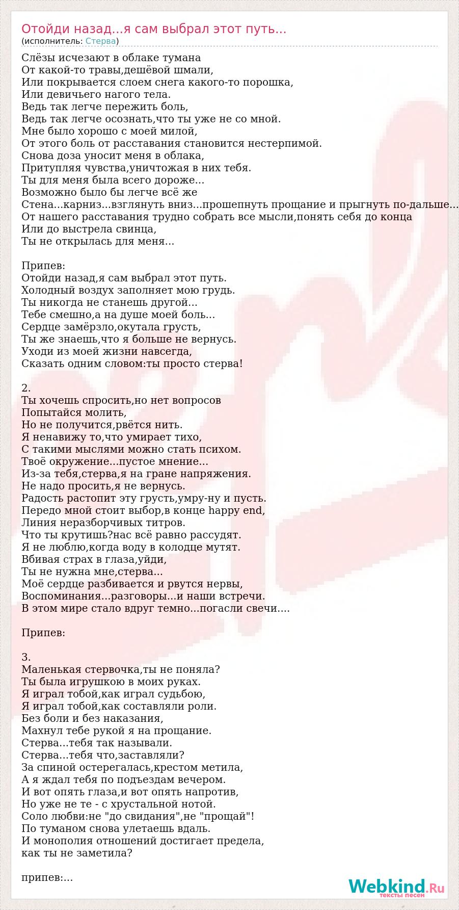 Слёзы исчезают в облаке тумана От какой-то травы,дешёвой шмали, Или покрывается слоем снега какого-то порошка, Или девичьего нагого тела. Ведь так легче пережить боль, Ведь так легче осознать,что ты уже не со мной. Мне было хорошо с моей милой, От этого боль от расставания становится нестерпимой. Снова доза уносит меня в облака, Притупляя чувства,уничтожая в них тебя. Ты для меня была всего дороже... Возможно было бы легче всё же Стена...карниз...взглянуть вниз...прошепнуть прощание и прыгнуть по-дальше... От нашего расставания трудно собрать все мысли,понять себя до конца Или до выстрела свинца, Ты не открылась для меня... Припев: Отойди назад,я сам выбрал этот путь. Холодный воздух заполняет мою грудь. Ты никогда не станешь другой... Тебе смешно,а на душе моей боль... Сердце замёрзло,окутала грусть, Ты же знаешь,что я больше не вернусь. Уходи из моей жизни навсегда, Сказать одним словом:ты просто стерва! 2. Ты хочешь спросить,но нет вопросов Попытайся молить, Но не получится,рвётся нить. Я ненавижу то,что умирает тихо, С такими мыслями можно стать психом. Твоё окружение...пустое мнение... Из-за тебя,стерва,я на гране напряжения. Не надо просить,я не вернусь. Радость растопит эту грусть,умру-ну и пусть. Передо мной стоит выбор,в конце happy end, Линия неразборчивых титров. Что ты крутишь?нас всё равно рассудят. Я не люблю,когда воду в колодце мутят. Вбивая страх в глаза,уйди, Ты не нужна мне,стерва... Моё сердце разбивается и рвутся нервы, Воспоминания...разговоры...и наши встречи. В этом мире стало вдруг темно...погасли свечи.... Припев: 3. Маленькая стервочка,ты не поняла? Ты была игрушкою в моих руках. Я играл тобой,как играл судьбою, Я играл тобой,как составляли роли. Без боли и без наказания, Махнул тебе рукой я на прощание. Стерва...тебя так называли. Стерва...тебя что,заставляли? За спиной остерегалась,крестом метила, А я ждал тебя по подъездам вечером. И вот опять глаза,и вот опять напротив, Но уже не те - с хрустальной нотой. Соло любви:не "до свидания",не "прощай"! По туманом снова улетаешь вдаль. И монополия отношений достигает предела, как ты не заметила? припев:...