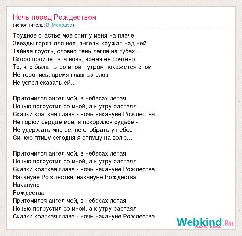 Трудное счастье мое спит у меня на плече Звезды горят для нее, ангелы кружат над ней Тайная грусть, словно тень легла на губах... Скоро пройдет эта ночь, время ее сочтено То, что была ты со мной - утром покажется сном Не торопись, время главных слов Не успел сказать ей... Притомился ангел мой, в небесах летая Ночью погрустил со мной, а к утру растаял Сказки краткая глава - ночь накануне Рождества... Не горюй сердце мое, я покорился судьбе - Не удержать мне ее, не отобрать у небес - Синюю птицу сегодня я отпущу на волю... Притомился ангел мой, в небесах летая Ночью погрустил со мной, а к утру растаял Сказки краткая глава - ночь накануне Рождества... Накануне Рождества, накануне Рождества Накануне Рождества Притомился ангел мой, в небесах летая Ночью погрустил со мной, а к утру растаял Сказки краткая глава - ночь накануне Рождества