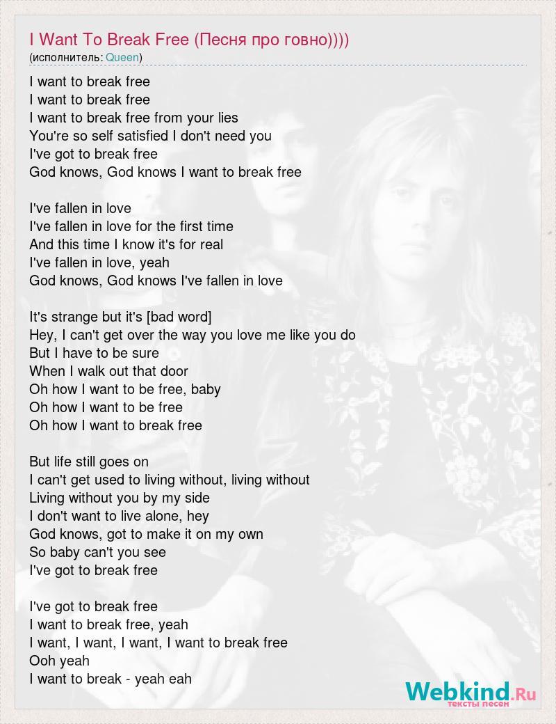 I want to break free I want to break free I want to break free from your lies You're so self satisfied I don't need you I've got to break free God knows, God knows I want to break free I've fallen in love I've fallen in love for the first time And this time I know it's for real I've fallen in love, yeah God knows, God knows I've fallen in love It's strange but it's [bad word] Hey, I can't get over the way you love me like you do But I have to be sure When I walk out that door Oh how I want to be free, baby Oh how I want to be free Oh how I want to break free But life still goes on I can't get used to living without, living without Living without you by my side I don't want to live alone, hey God knows, got to make it on my own So baby can't you see I've got to break free I've got to break free I want to break free, yeah I want, I want, I want, I want to break free Ooh yeah I want to break - yeah eah