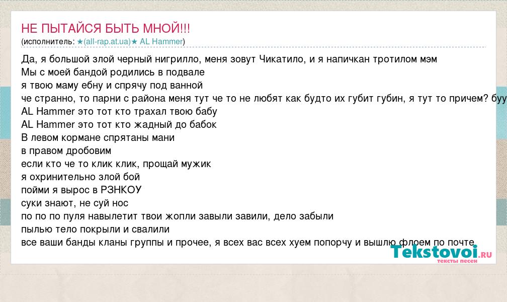 Да, я большой злой черный нигрилло, меня зовут Чикатило, и я напичкан тротилом мэм Мы с моей бандой родились в подвале я твою маму ебну и спрячу под ванной че странно, то парни с района меня тут че то не любят как будто их губит губин, я тут то причем? буу AL Hammer это тот кто трахал твою бабу AL Hammer это тот кто жадный до бабок В левом кормане спрятаны мани в правом дробовим если кто че то клик клик, прощай мужик я охринительно злой бой пойми я вырос в РЗНКОУ суки знают, не суй нос по по по пуля навылетит твои жопли завыли завили, дело забыли пылью тело покрыли и свалили все ваши банды кланы группы и прочее, я всех вас всех хуем попорчу и вышлю флоем по почте