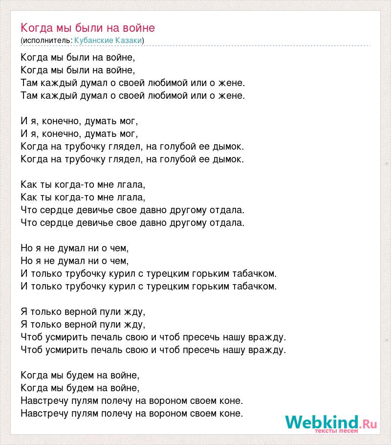Когда мы были на войне, Когда мы были на войне, Там каждый думал о своей любимой или о жене. Там каждый думал о своей любимой или о жене. И я, конечно, думать мог, И я, конечно, думать мог, Когда на трубочку глядел, на голубой ее дымок. Когда на трубочку глядел, на голубой ее дымок. Как ты когда-то мне лгала, Как ты когда-то мне лгала, Что сердце девичье свое давно другому отдала. Что сердце девичье свое давно другому отдала. Но я не думал ни о чем, Но я не думал ни о чем, И только трубочку курил с турецким горьким табачком. И только трубочку курил с турецким горьким табачком. Я только верной пули жду, Я только верной пули жду, Чтоб усмирить печаль свою и чтоб пресечь нашу вражду. Чтоб усмирить печаль свою и чтоб пресечь нашу вражду. Когда мы будем на войне, Когда мы будем на войне, Навстречу пулям полечу на вороном своем коне. Навстречу пулям полечу на вороном своем коне.