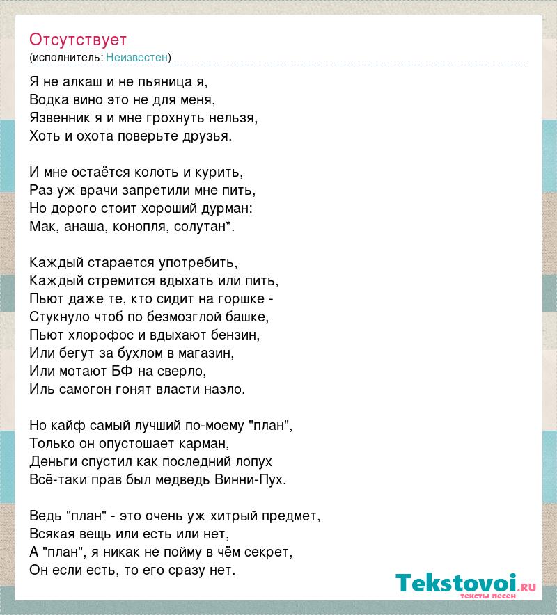 Я не алкаш и не пьяница я, Водка вино это не для меня, Язвенник я и мне грохнуть нельзя, Хоть и охота поверьте друзья. И мне остаётся колоть и курить, Раз уж врачи запретили мне пить, Но дорого стоит хороший дурман: Мак, анаша, конопля, солутан*. Каждый старается употребить, Каждый стремится вдыхать или пить, Пьют даже те, кто сидит на горшке - Стукнуло чтоб по безмозглой башке, Пьют хлорофос и вдыхают бензин, Или бегут за бухлом в магазин, Или мотают БФ на сверло, Иль самогон гонят власти назло. Но кайф самый лучший по-моему "план", Только он опустошает карман, Деньги спустил как последний лопух Всё-таки прав был медведь Винни-Пух. Ведь "план" - это очень уж хитрый предмет, Всякая вещь или есть или нет, А "план", я никак не пойму в чём секрет, Он если есть, то его сразу нет.