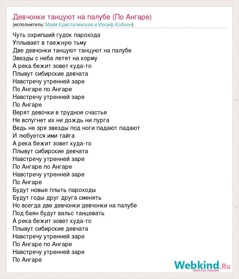 Чуть охрипший гудок парохода Уплывает в таежную тьму Две девчонки танцуют танцуют на палубе Звезды с неба летят на корму А река бежит зовет куда-то Плывут сибирские девчата Навстречу утренней заре По Ангаре по Ангаре Навстречу утренней заре По Ангаре Верят девочки в трудное счастье Не вспугнет их ни дождь ни пурга Ведь не зря звезды под ноги падают падают И любуется ими тайга А река бежит зовет куда-то Плывут сибирские девчата Навстречу утренней заре По Ангаре по Ангаре Навстречу утренней заре По Ангаре Будут новые плыть пароходы Будут годы друг друга сменять Но всегда две девчонки девчонки на палубе Под баян будут вальс танцевать А река бежит зовет куда-то Плывут сибирские девчата Навстречу утренней заре По Ангаре по Ангаре Навстречу утренней заре По Ангаре