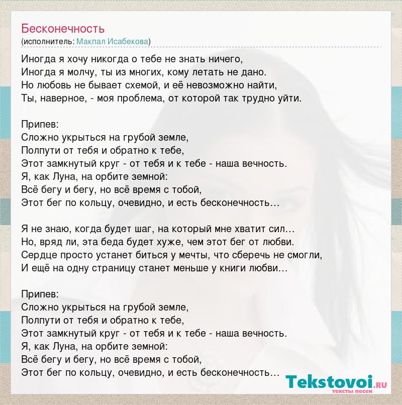 Иногда я хочу никогда о тебе не знать ничего, Иногда я молчу, ты из многих, кому летать не дано. Но любовь не бывает схемой, и её невозможно найти, Ты, наверное, - моя проблема, от которой так трудно уйти. Припев: Сложно укрыться на грубой земле, Полпути от тебя и обратно к тебе, Этот замкнутый круг - от тебя и к тебе - наша вечность. Я, как Луна, на орбите земной: Всё бегу и бегу, но всё время с тобой, Этот бег по кольцу, очевидно, и есть бесконечность… Я не знаю, когда будет шаг, на который мне хватит сил… Но, вряд ли, эта беда будет хуже, чем этот бег от любви. Сердце просто устанет биться у мечты, что сберечь не смогли, И ещё на одну страницу станет меньше у книги любви… Припев: Сложно укрыться на грубой земле, Полпути от тебя и обратно к тебе, Этот замкнутый круг - от тебя и к тебе - наша вечность. Я, как Луна, на орбите земной: Всё бегу и бегу, но всё время с тобой, Этот бег по кольцу, очевидно, и есть бесконечность…