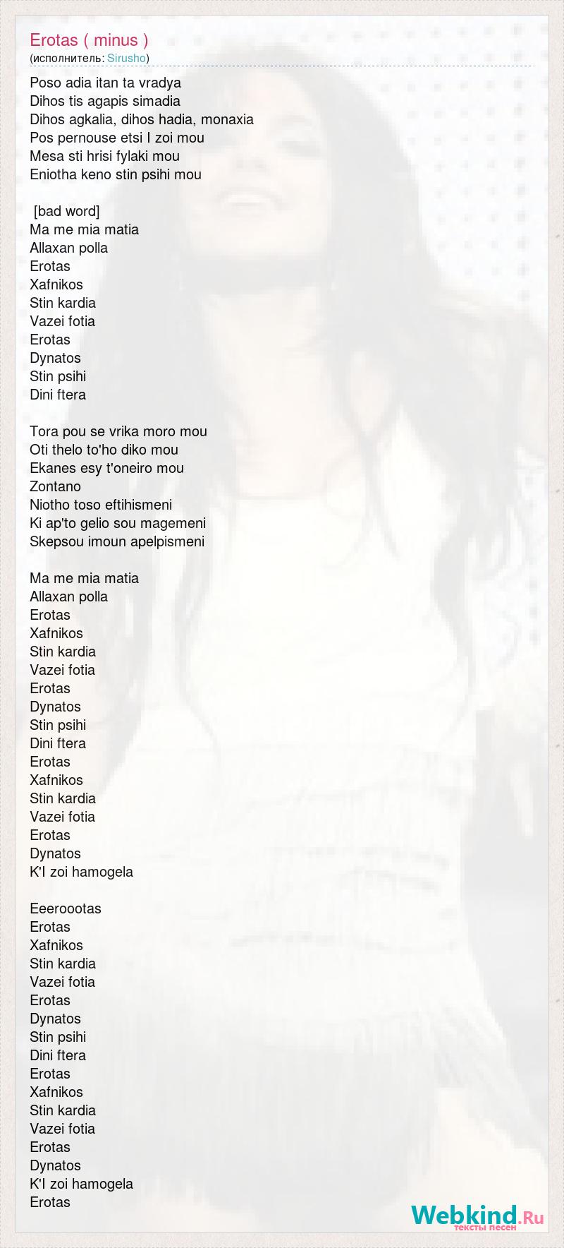 Poso adia itan ta vradya Dihos tis agapis simadia Dihos agkalia, dihos hadia, monaxia Pos pernouse etsi I zoi mou Mesa sti hrisi fylaki mou Eniotha keno stin psihi mou [bad word] Ma me mia matia Allaxan polla Erotas Xafnikos Stin kardia Vazei fotia Erotas Dynatos Stin psihi Dini ftera Tora pou se vrika moro mou Oti thelo to'ho diko mou Ekanes esy t'oneiro mou Zontano Niotho toso eftihismeni Ki ap'to gelio sou magemeni Skepsou imoun apelpismeni Ma me mia matia Allaxan polla Erotas Xafnikos Stin kardia Vazei fotia Erotas Dynatos Stin psihi Dini ftera Erotas Xafnikos Stin kardia Vazei fotia Erotas Dynatos K'I zoi hamogela Eeeroootas Erotas Xafnikos Stin kardia Vazei fotia Erotas Dynatos Stin psihi Dini ftera Erotas Xafnikos Stin kardia Vazei fotia Erotas Dynatos K'I zoi hamogela Erotas