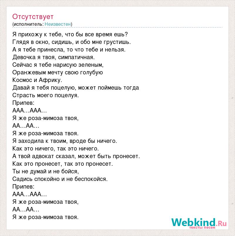 Я прихожу к тебе, что бы все время ешь? Глядя в окно, сидишь, и обо мне грустишь. А я тебе принесла, то что тебе и нельзя. Девочка я твоя, симпатичная. Сейчас я тебе нарисую зеленым, Оранжевым мечту свою голубую Космос и Африку. Давай я тебя поцелую, может поймешь тогда Страсть моего поцелуя. Припев: ААА…ААА… Я же роза-мимоза твоя, АА…АА… Я же роза-мимоза твоя. Я заходила к твоим, вроде бы ничего. Как это ничего, так это ничего. А твой адвокат сказал, может быть пронесет. Как это пронесет, так это пронесет. Ты не думай и не бойся, Садись спокойно и не беспокойся. Припев: ААА…ААА… Я же роза-мимоза твоя, АА…АА… Я же роза-мимоза твоя.