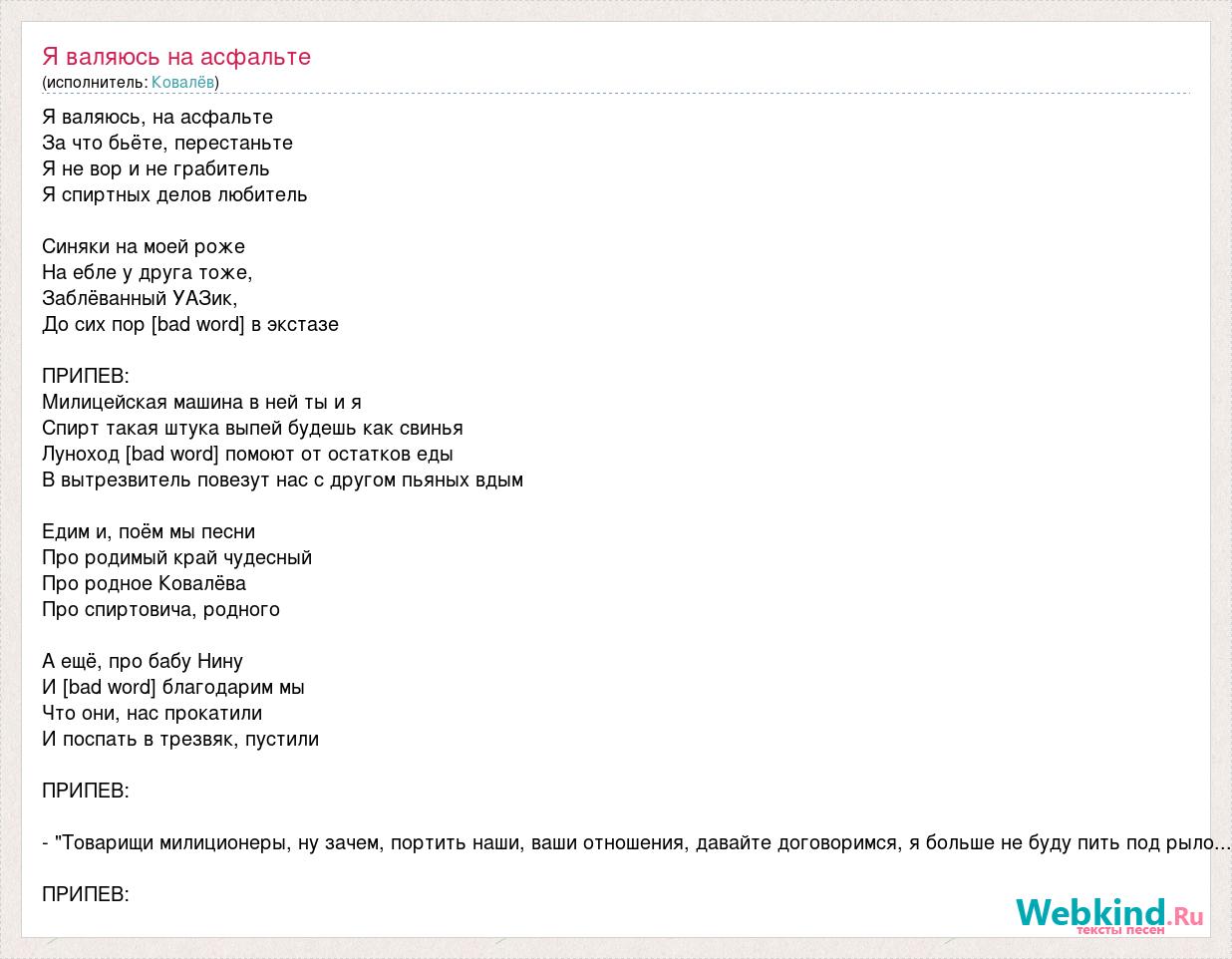 Я валяюсь, на асфальте За что бьёте, перестаньте Я не вор и не грабитель Я спиртных делов любитель Синяки на моей роже На ебле у друга тоже, Заблёванный УАЗик, До сих пор [bad word] в экстазе ПРИПЕВ: Милицейская машина в ней ты и я Спирт такая штука выпей будешь как свинья Луноход [bad word] помоют от остатков еды В вытрезвитель повезут нас с другом пьяных вдым Едим и, поём мы песни Про родимый край чудесный Про родное Ковалёва Про спиртовича, родного А ещё, про бабу Нину И [bad word] благодарим мы Что они, нас прокатили И поспать в трезвяк, пустили ПРИПЕВ: - "Товарищи милиционеры, ну зачем, портить наши, ваши отношения, давайте договоримся, я больше не буду пить под рыло... ПРИПЕВ: