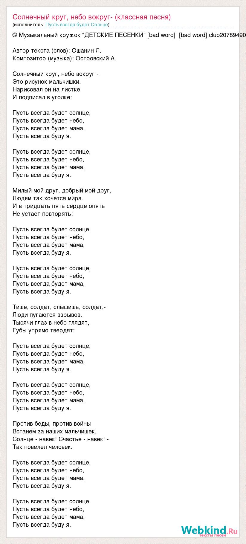 © Музыкальный кружок "ДЕТСКИЕ ПЕСЕНКИ" [bad word] [bad word] club20789490 Автор текста (слов): Ошанин Л. Композитор (музыка): Островский А. Солнечный круг, небо вокруг - Это рисунок мальчишки. Нарисовал он на листке И подписал в уголке: Пусть всегда будет солнце, Пусть всегда будет небо, Пусть всегда будет мама, Пусть всегда буду я. Пусть всегда будет солнце, Пусть всегда будет небо, Пусть всегда будет мама, Пусть всегда буду я. Милый мой друг, добрый мой друг, Людям так хочется мира. И в тридцать пять сердце опять Не устает повторять: Пусть всегда будет солнце, Пусть всегда будет небо, Пусть всегда будет мама, Пусть всегда буду я. Пусть всегда будет солнце, Пусть всегда будет небо, Пусть всегда будет мама, Пусть всегда буду я. Тише, солдат, слышишь, солдат,- Люди пугаются взрывов. Тысячи глаз в небо глядят, Губы упрямо твердят: Пусть всегда будет солнце, Пусть всегда будет небо, Пусть всегда будет мама, Пусть всегда буду я. Пусть всегда будет солнце, Пусть всегда будет небо, Пусть всегда будет мама, Пусть всегда буду я. Против беды, против войны Встанем за наших мальчишек. Солнце - навек! Счастье - навек! - Так повелел человек. Пусть всегда будет солнце, Пусть всегда будет небо, Пусть всегда будет мама, Пусть всегда буду я. Пусть всегда будет солнце, Пусть всегда будет небо, Пусть всегда будет мама, Пусть всегда буду я.